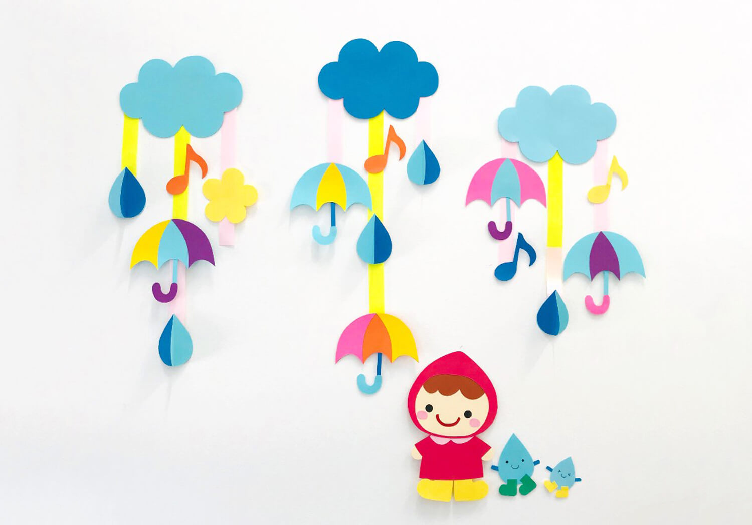 子どもたちが大好きな雨や傘をモチーフにした壁面をご紹介!吊るし飾りになっているので、壁だけでなく天井から吊るしても可愛いですよ♪