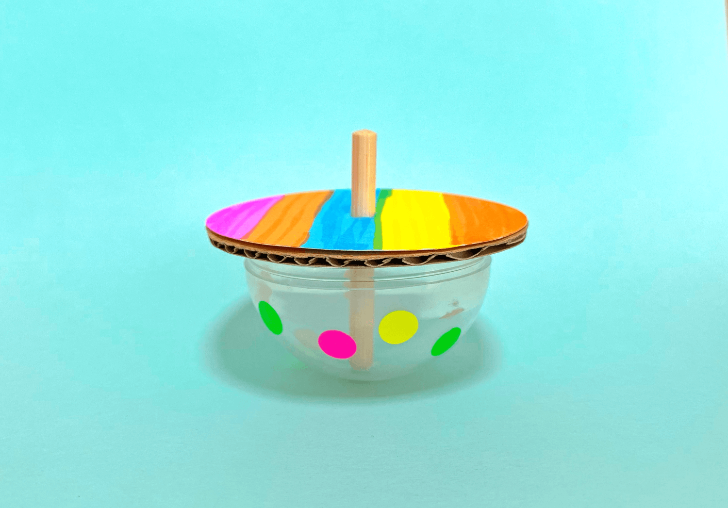 底の部分が丸い、低年齢児さんでも簡単に回せるコマ。ダンボールの部分を持てば、小さな手でもクルっと回すことができます!室内遊びが増える雨の季節におすすめの製作アイデアです。