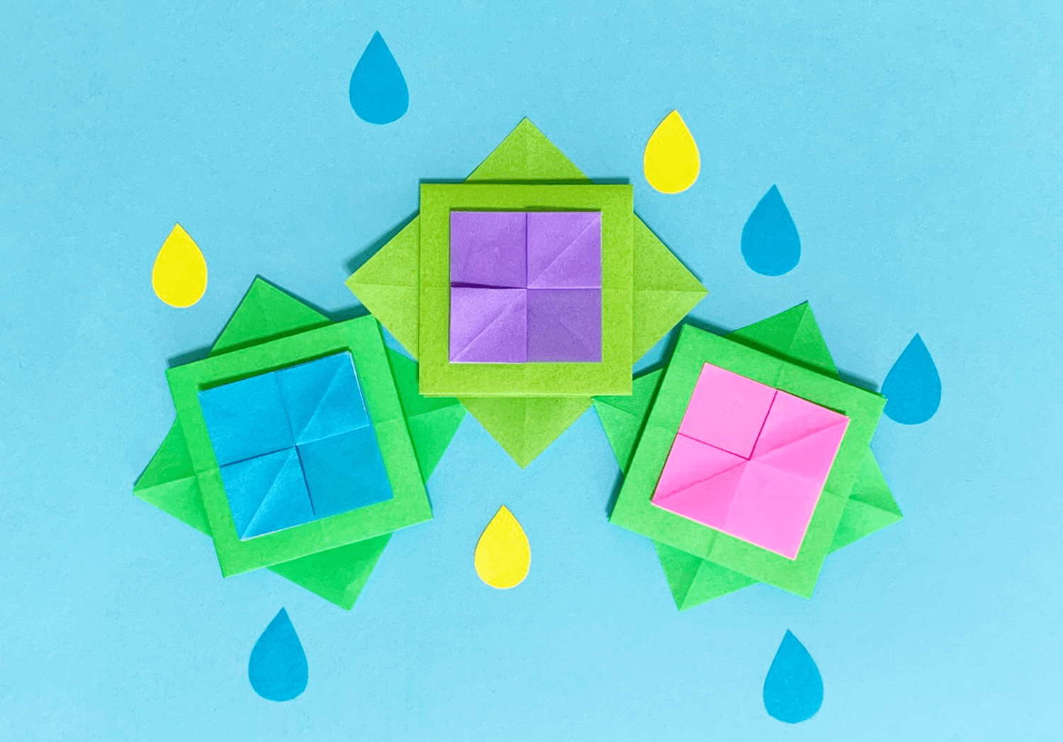 雨の季節におすすめ!簡単に作れる「あじさい」です。2枚のおりがみで葉とがくを分けて作ります。お部屋遊びが多くなる6月にぴったりのおりがみです。
