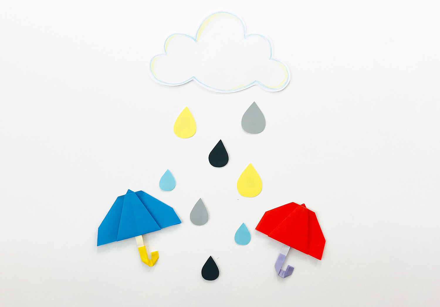 細く切った画用紙(紙テープでもOK)にしずくや傘、雲などを自由にペタペタ貼っていきましょう♪色とりどりの飾りを天井や壁面に吊るしてみてくださいいね。