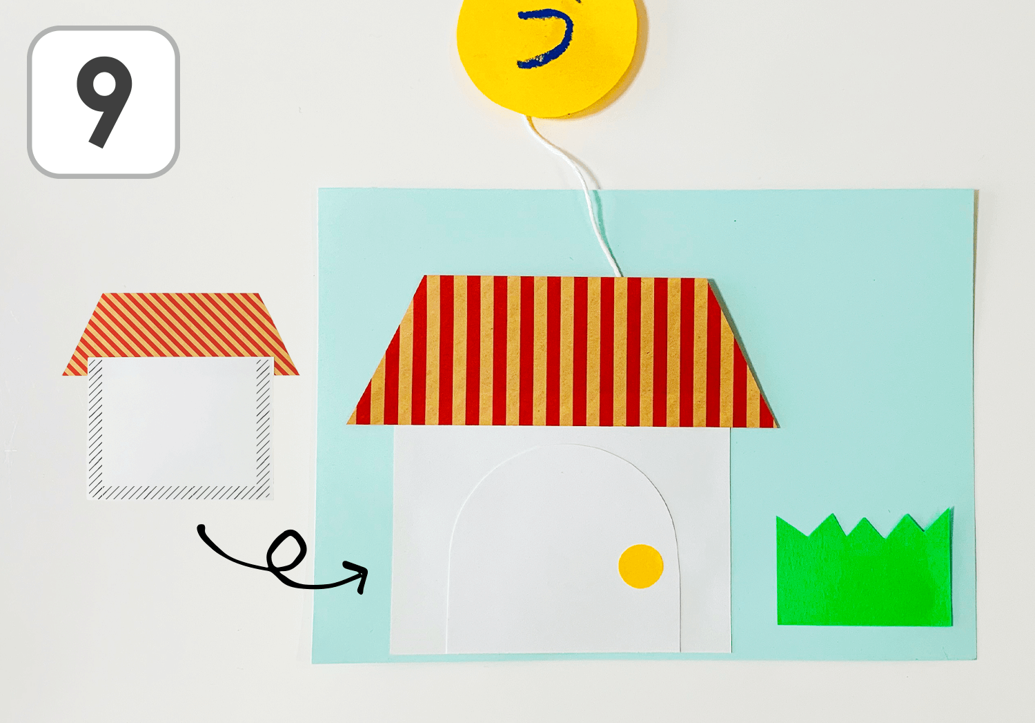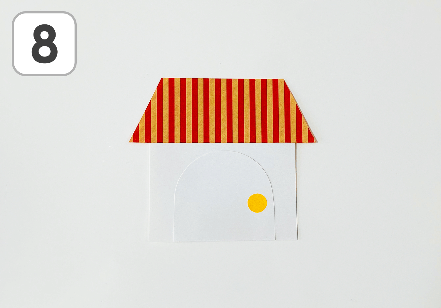 ⑨できたお家の裏に向け、写真の斜線部分にのりを塗り、カード台紙に貼り付けます。