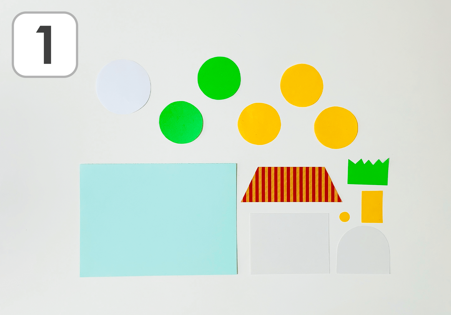 白の丸には顔を、黄色と黄緑の丸には〈ありがとう〉の文字を書きます。