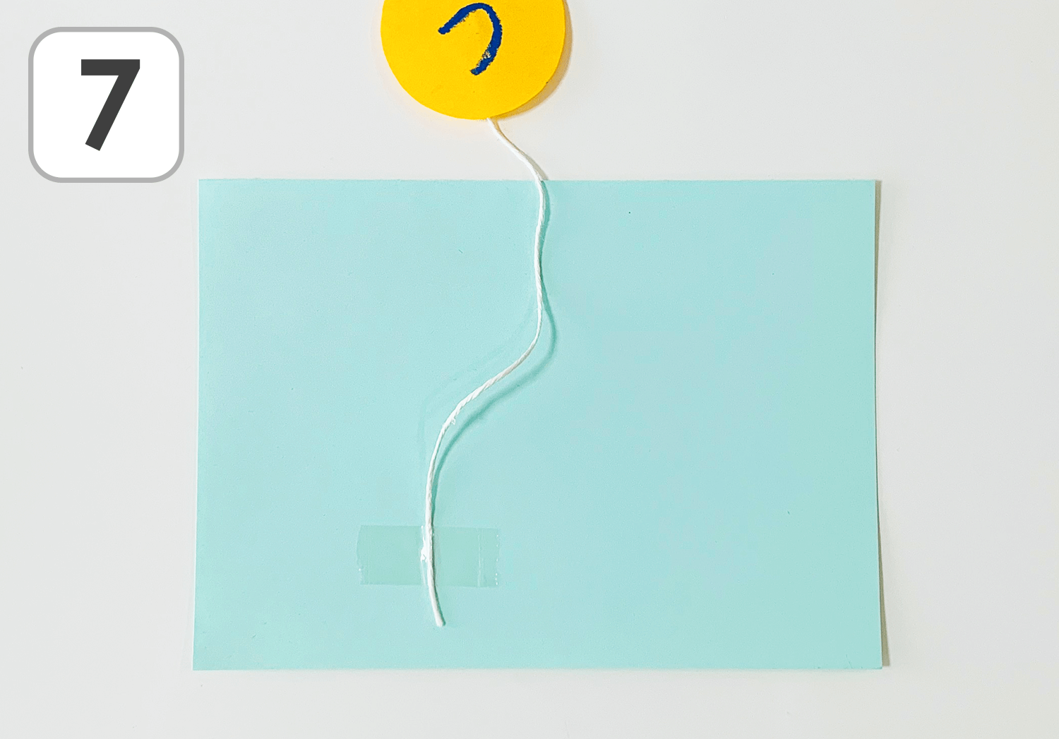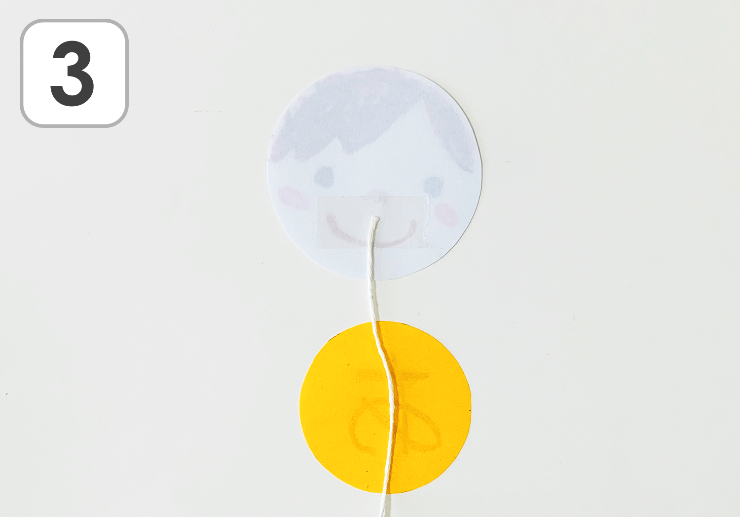 2で絵と顔を描いた白い丸を裏に向けて、紐の端をセロハンテープで貼り付けます。
