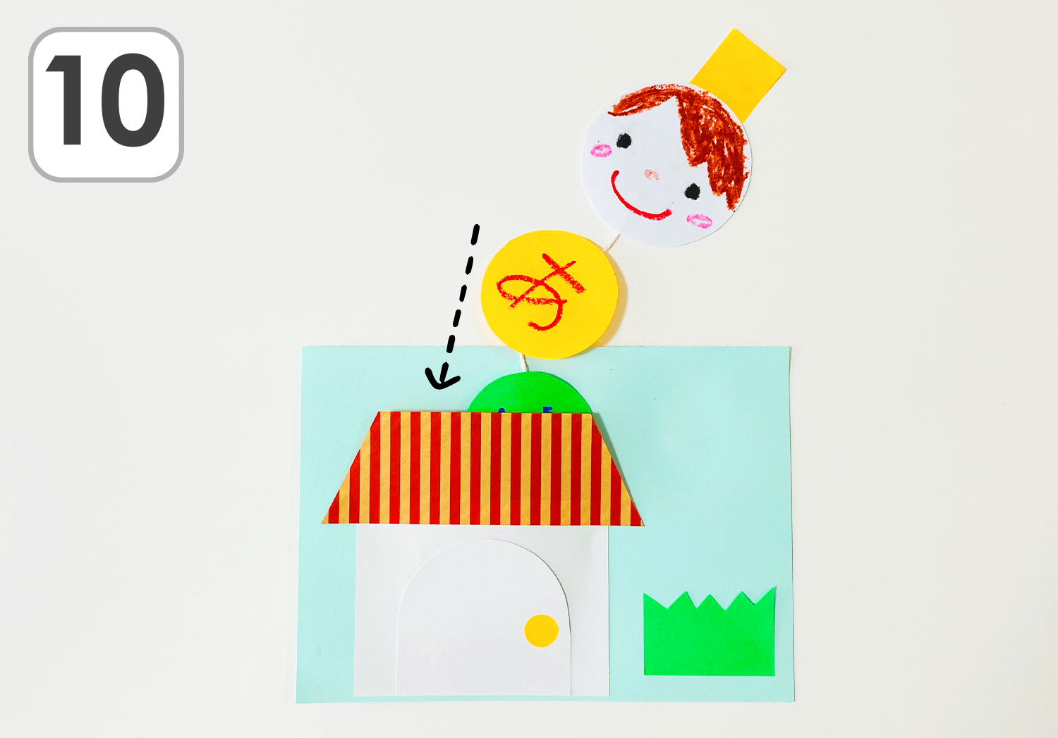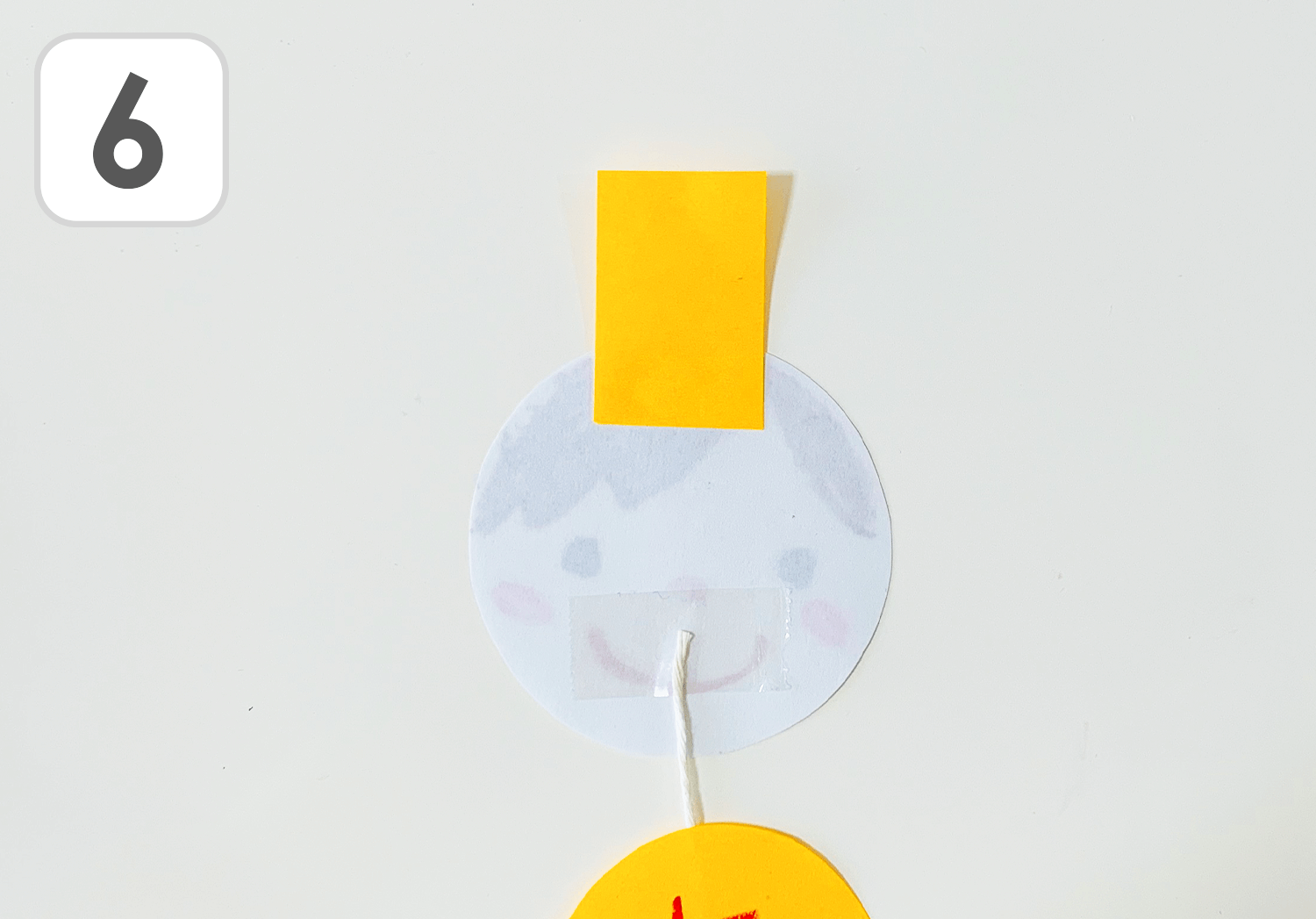 ⑥次に、顔を描いた白い丸の裏に、煙突用に切った黄色の長方形を、のりで写真のように貼り付けます。