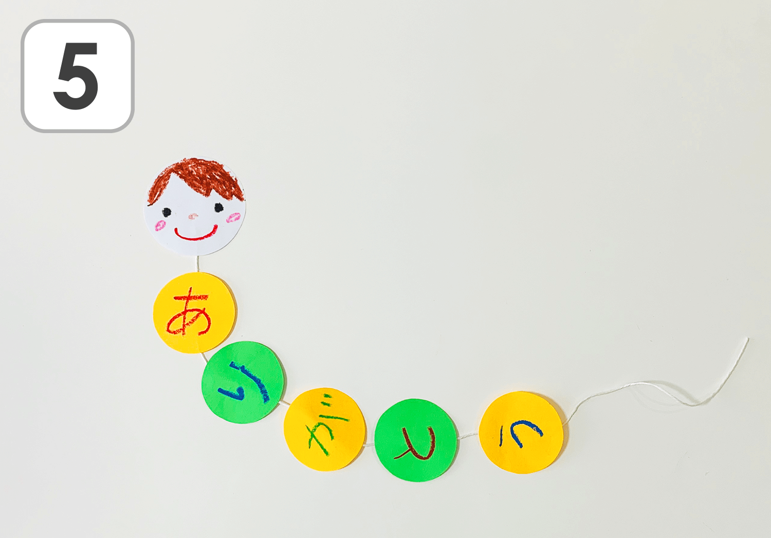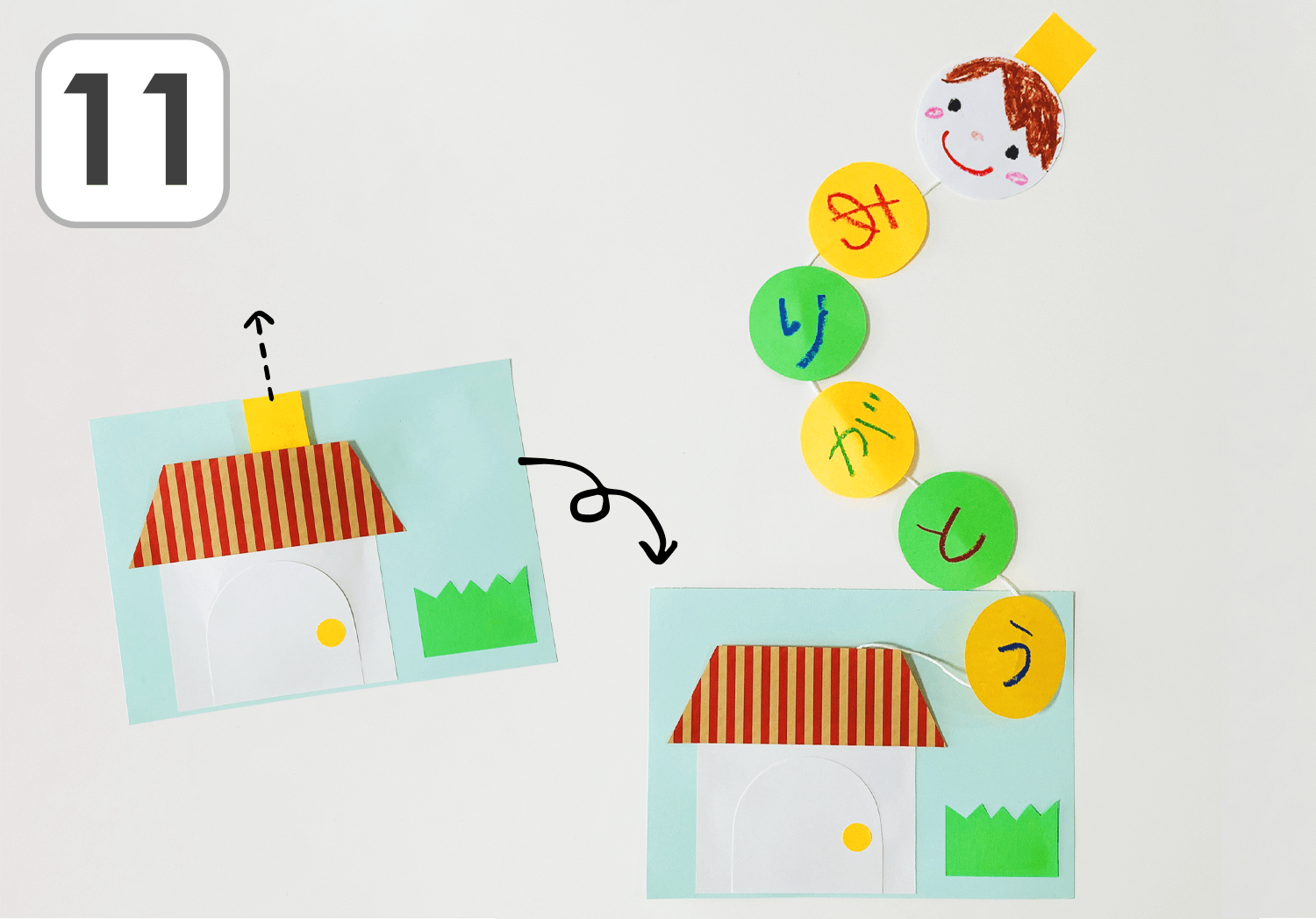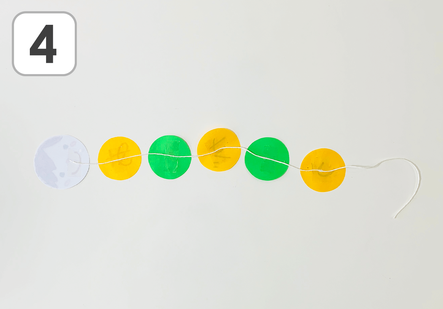 ④〈ありがとう〉を書いた黄緑と黄色の丸も裏に向けて、紐を貼り付けます。
