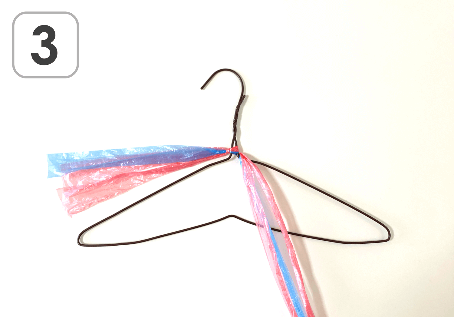 ③1で作った結び目を、写真のようにハンガーの首の部分に通します。