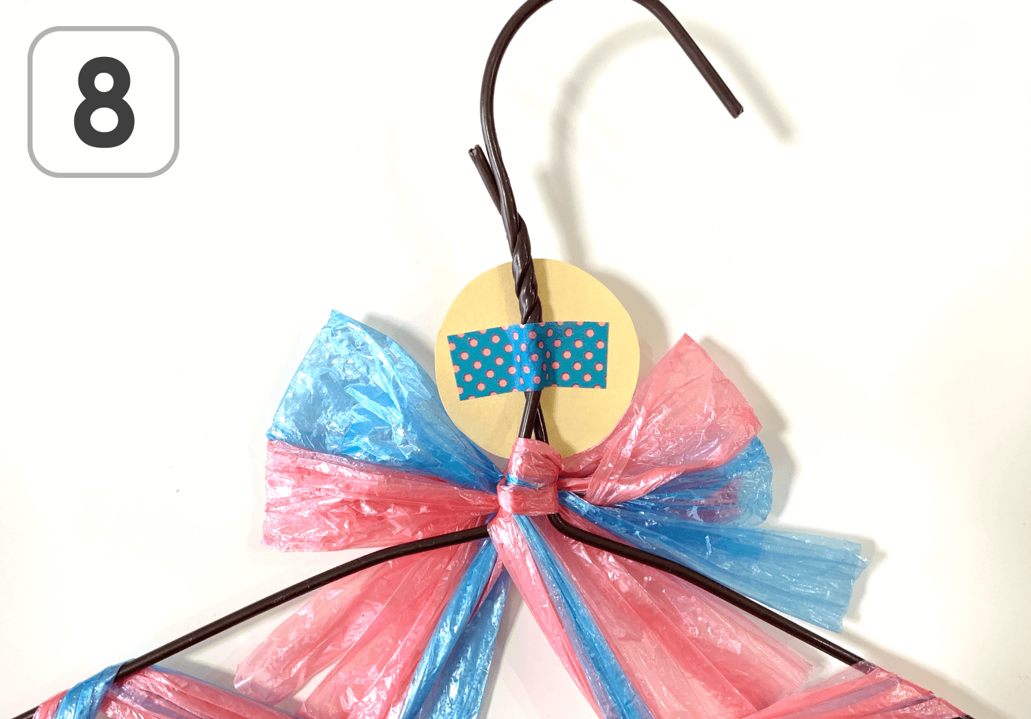 ⑧円をはさみで切り取り、リボンの上に来るように、マスキングテープでハンガーに貼り付けます。