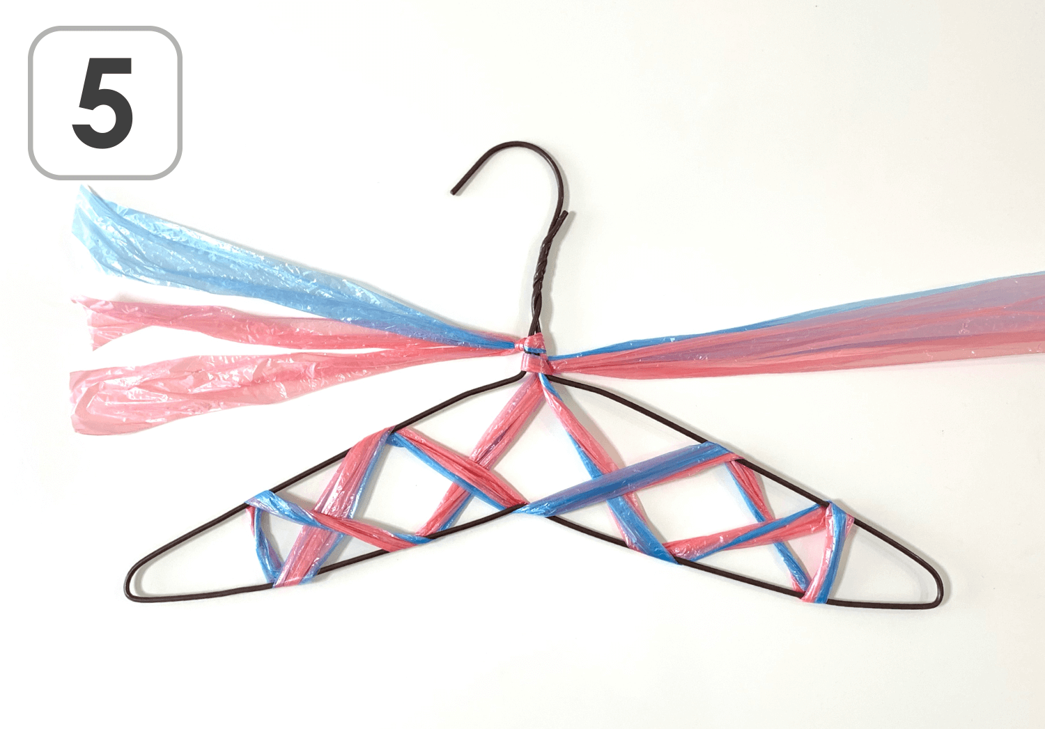 ⑤真ん中まで戻ってきたら、ハンガーの下のくぼみに引っ掛けて、左側も同じように巻きます。