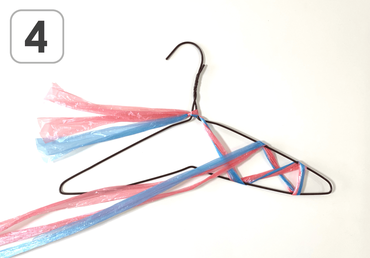 ④スズランテープの長い方を、右側からハンガーに巻き付けていきます。