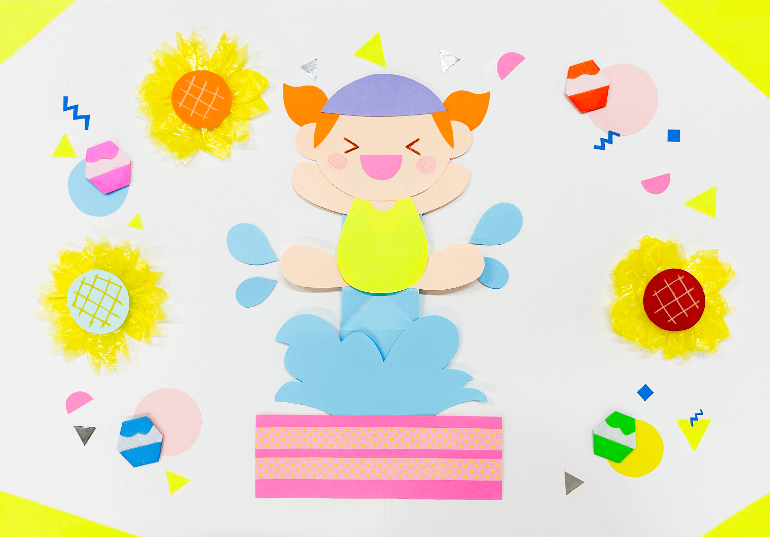 暑い日の遊びといえば水遊び!楽しい水遊びの製作を中心に、スズランテープのひまわりやおりがみのかき氷と一緒に、夏らしく元気いっぱいに飾ってみてくださいね。