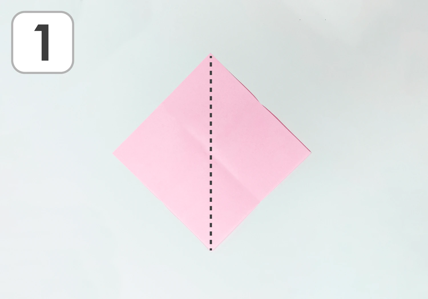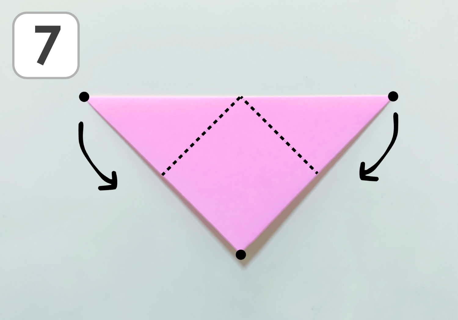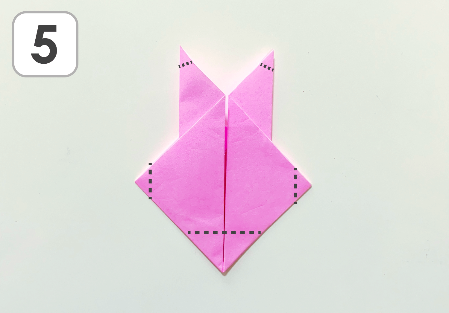 三角に一度折り、●を合わせるように点線に沿って折ります。