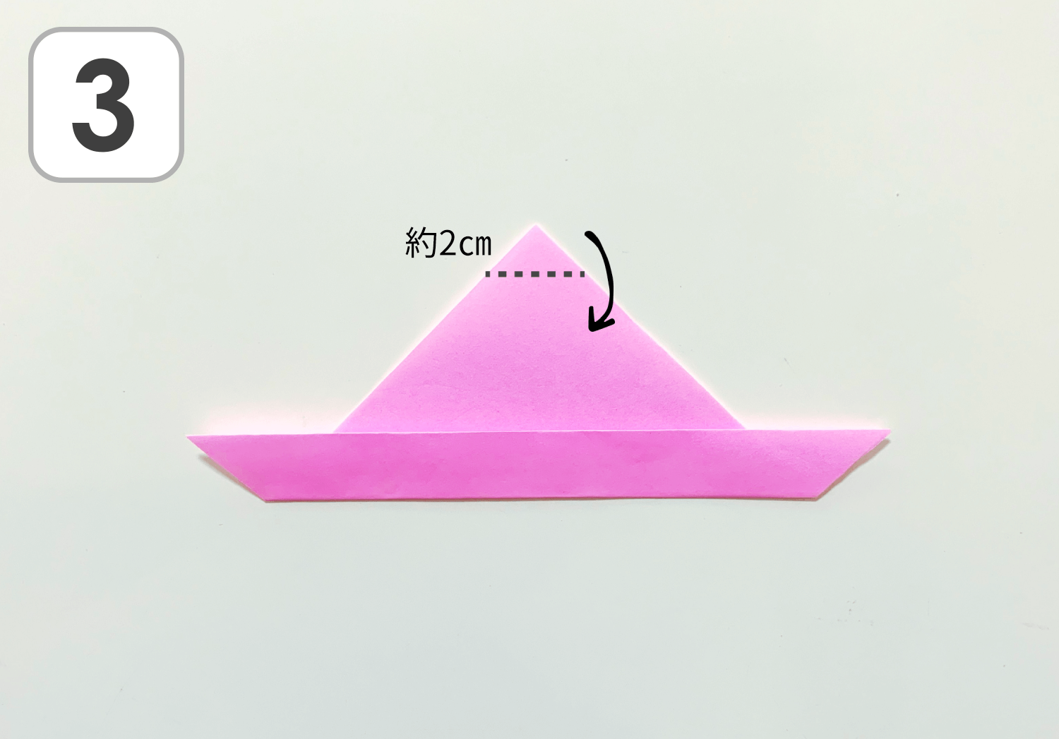 ②下から上に三角に折り、画像のようになったら、下の辺を1.5㎝位の幅で上向きに折り上げます。