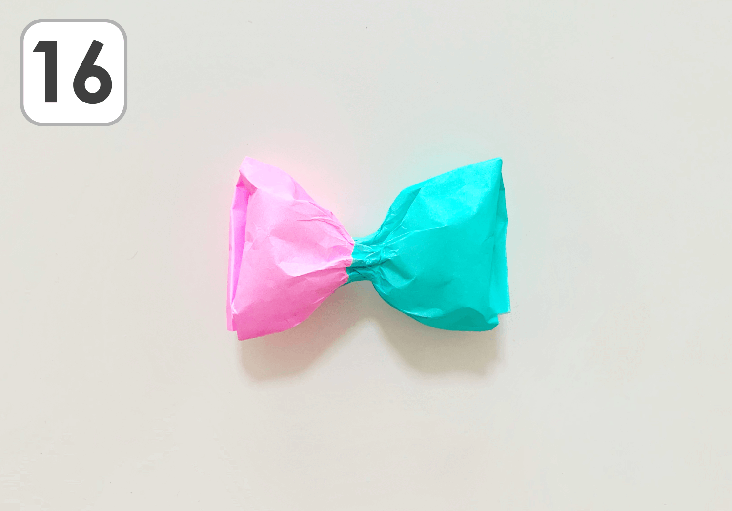 ⑯裏を向けて、中央を指でぎゅっと摘まむとリボンの形になりました。