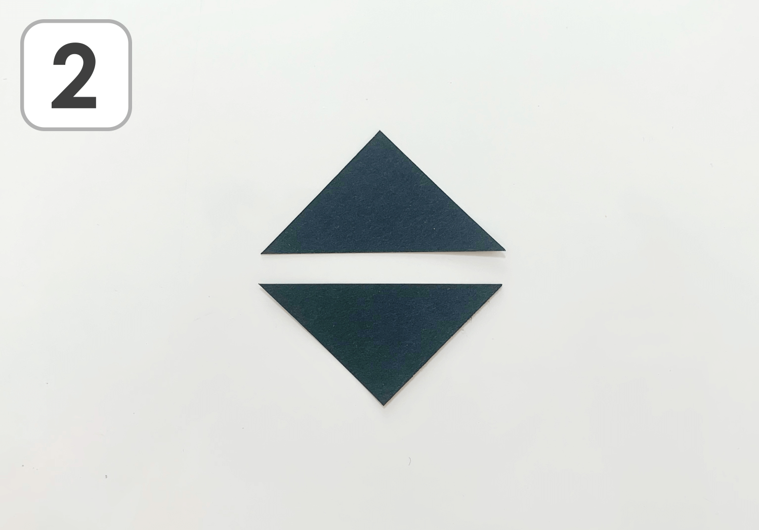 ②1でできた黒の正方形の紙を、写真のように三角形が2枚になるように切ります。