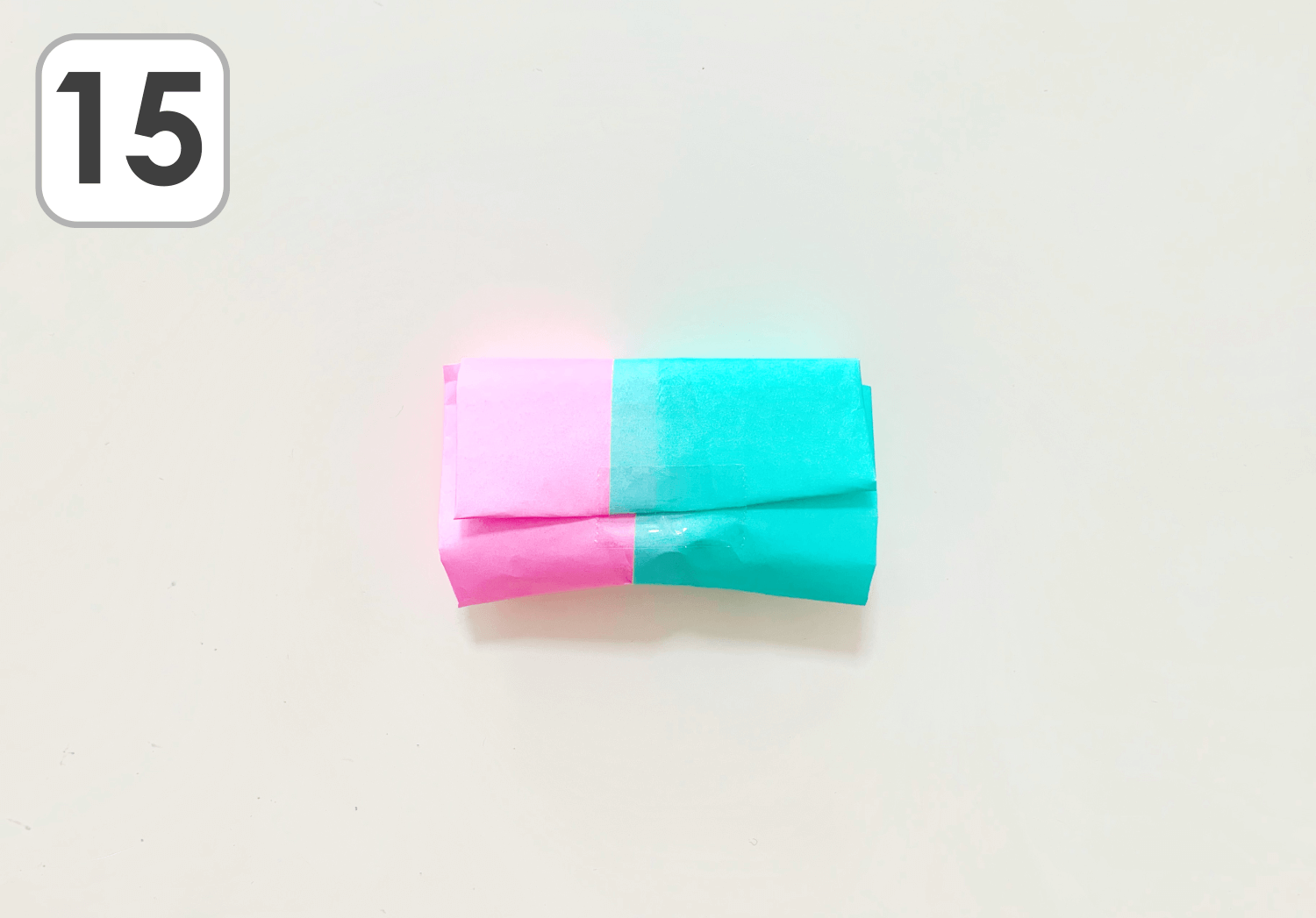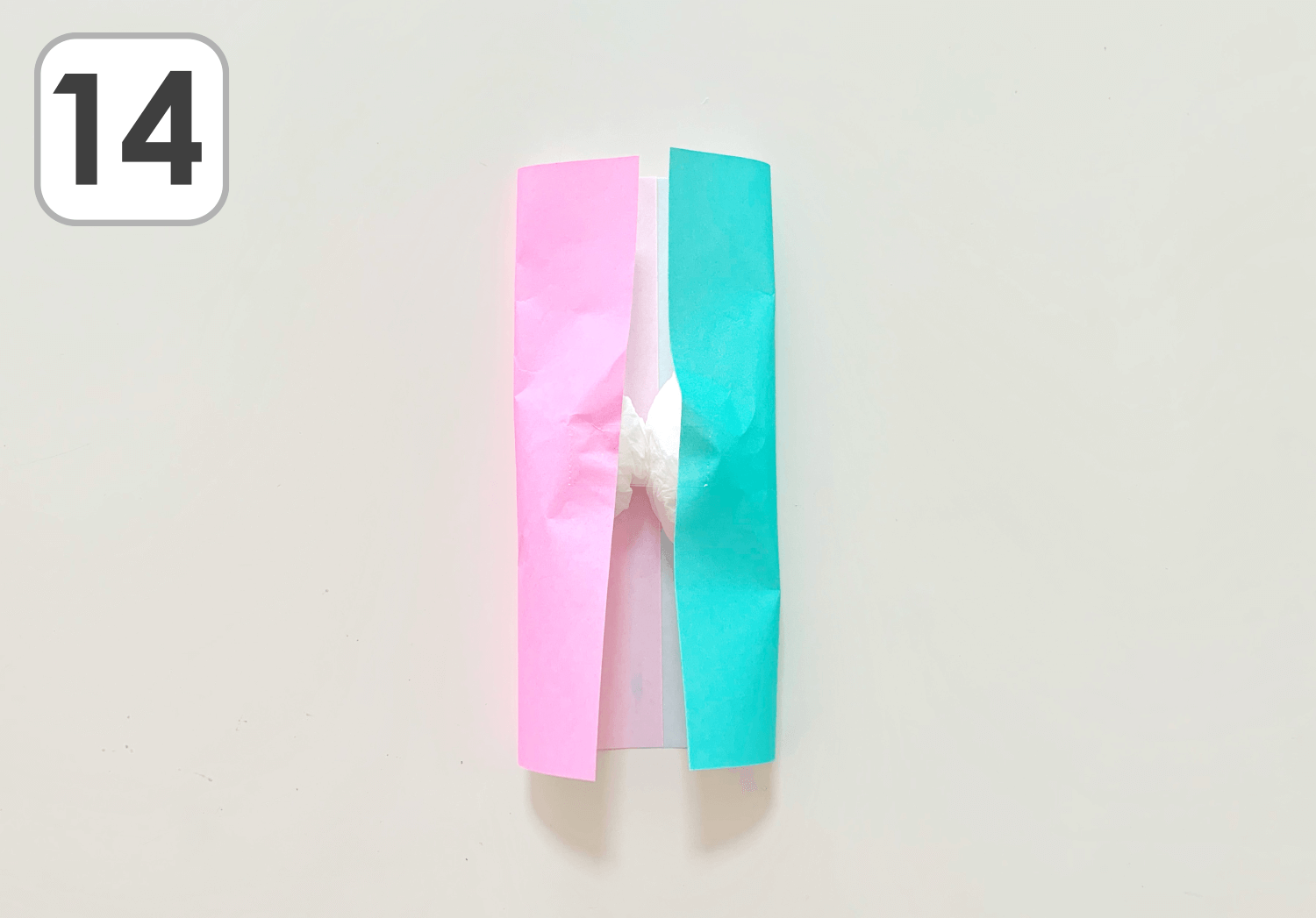 ⑭左右からティッシュを包むようにして、おりがみをセロハンテープでとめます。