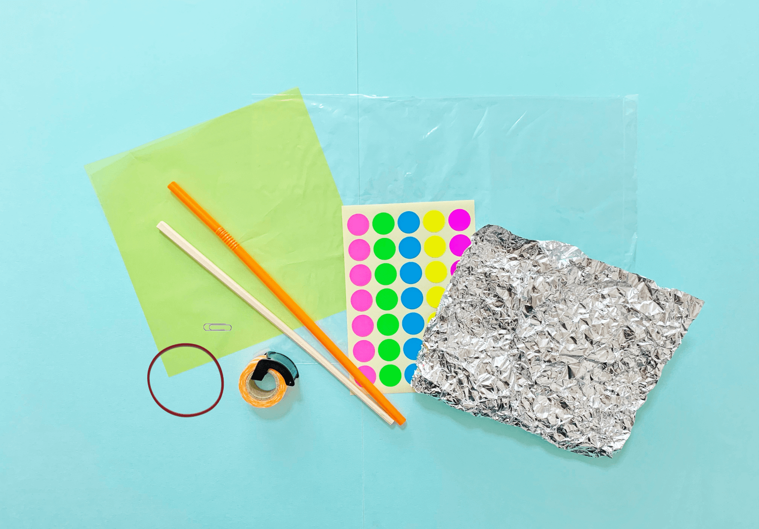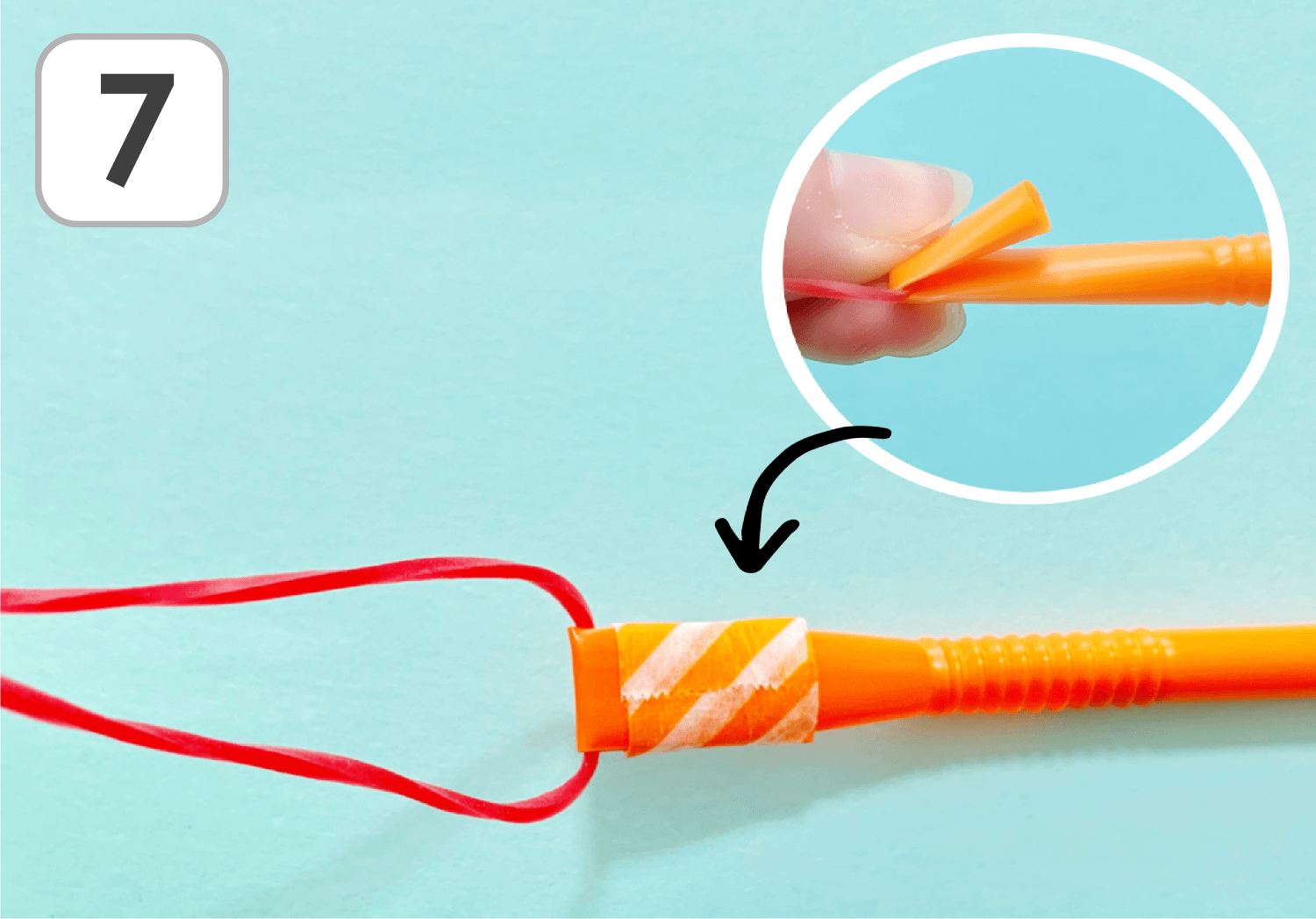 ⑦ストローの先を折り曲げ、5の輪ゴムの先を挟んでマスキングテープでとめます。