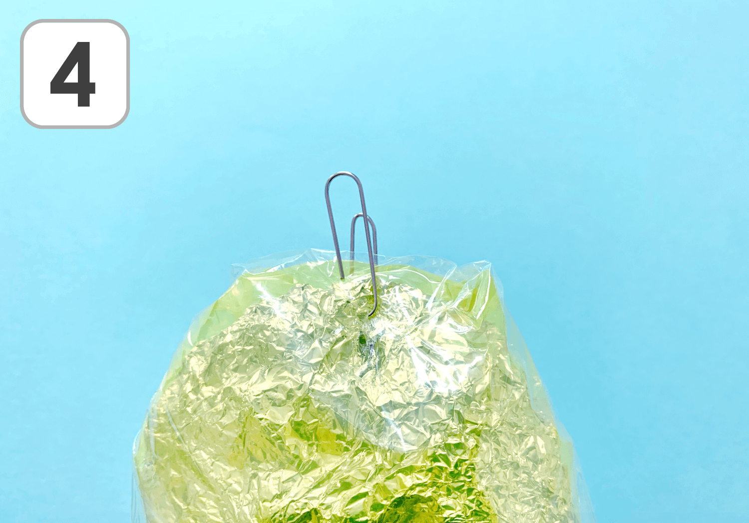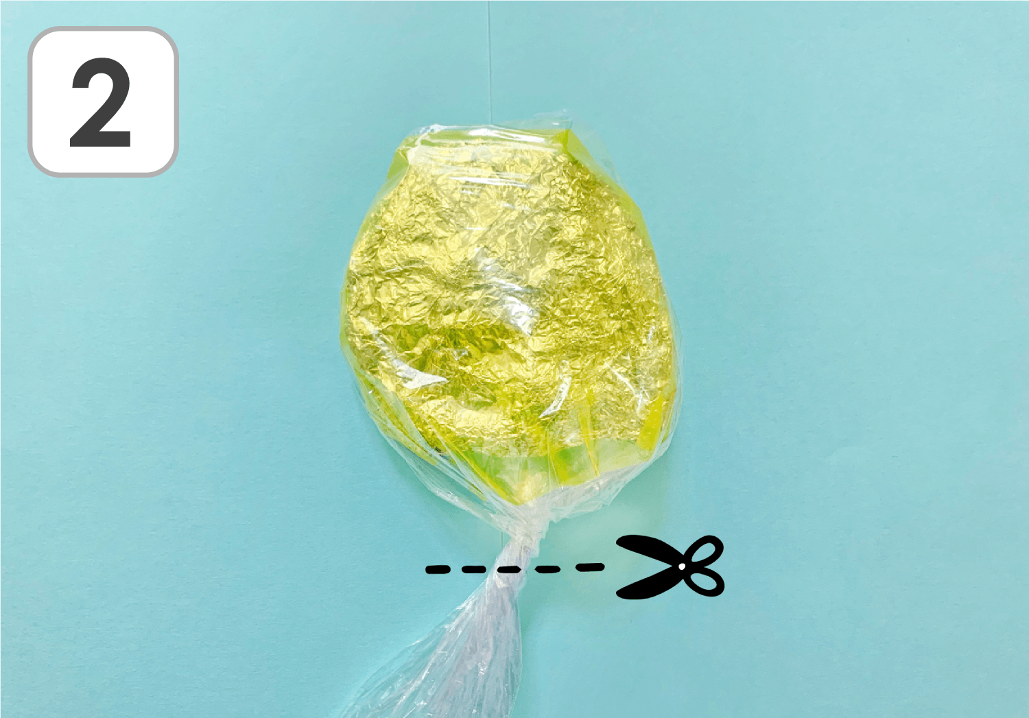②1をビニール袋に入れ、袋の余った部分をねじり、ねじった部分をはさみで切ります。ねじったまま切ることで、切り口がナミナミの形になるのです!