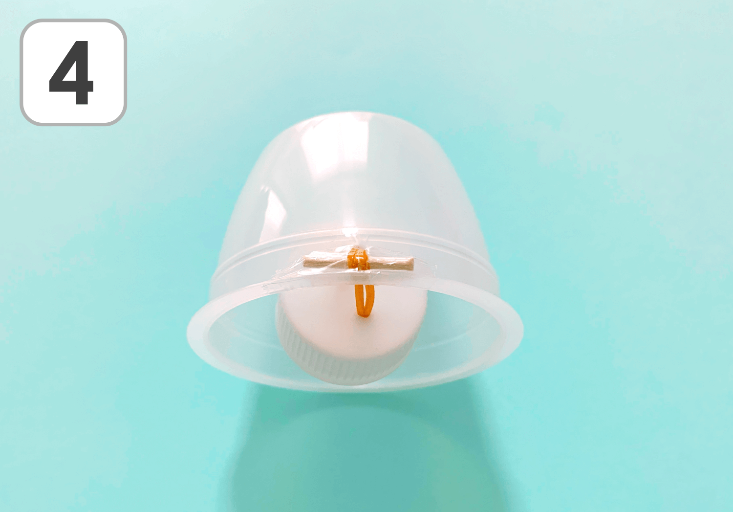 ④プリンカップにあけた穴に、3の輪ゴムを内側から通します。出てきた輪ゴムの先につまようじを通して、セロハンテープで固定してください。