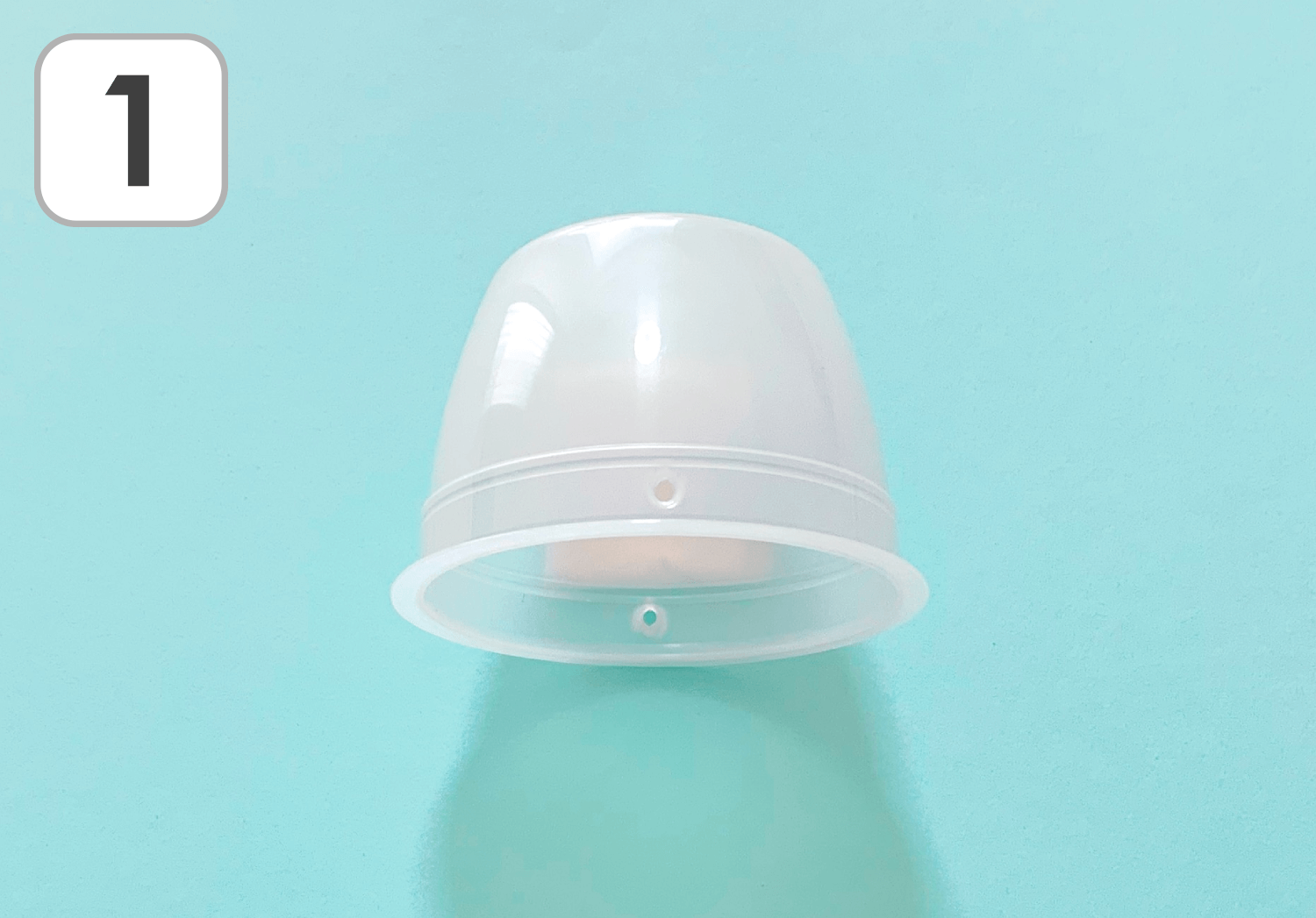 ①プリンカップの淵に近いところに、キリを使って穴をあけます。
