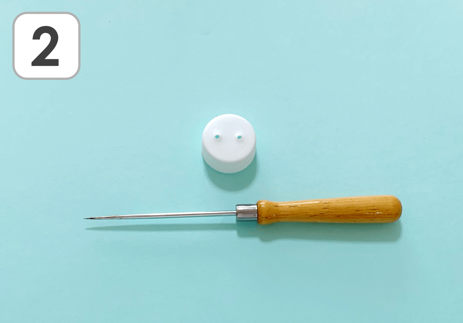 ②ペットボトルの蓋に、キリを使って2つ穴をあけます。