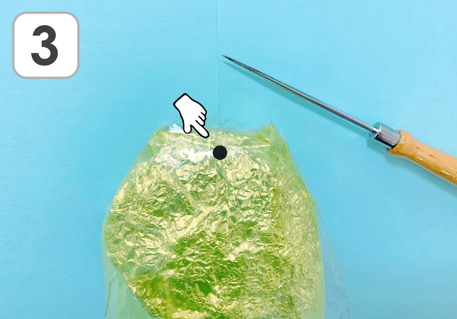 ③上から1cmくらいのところにキリで穴をあけます。このとき、袋とアルミホイル両方に穴が開くようにしてください。