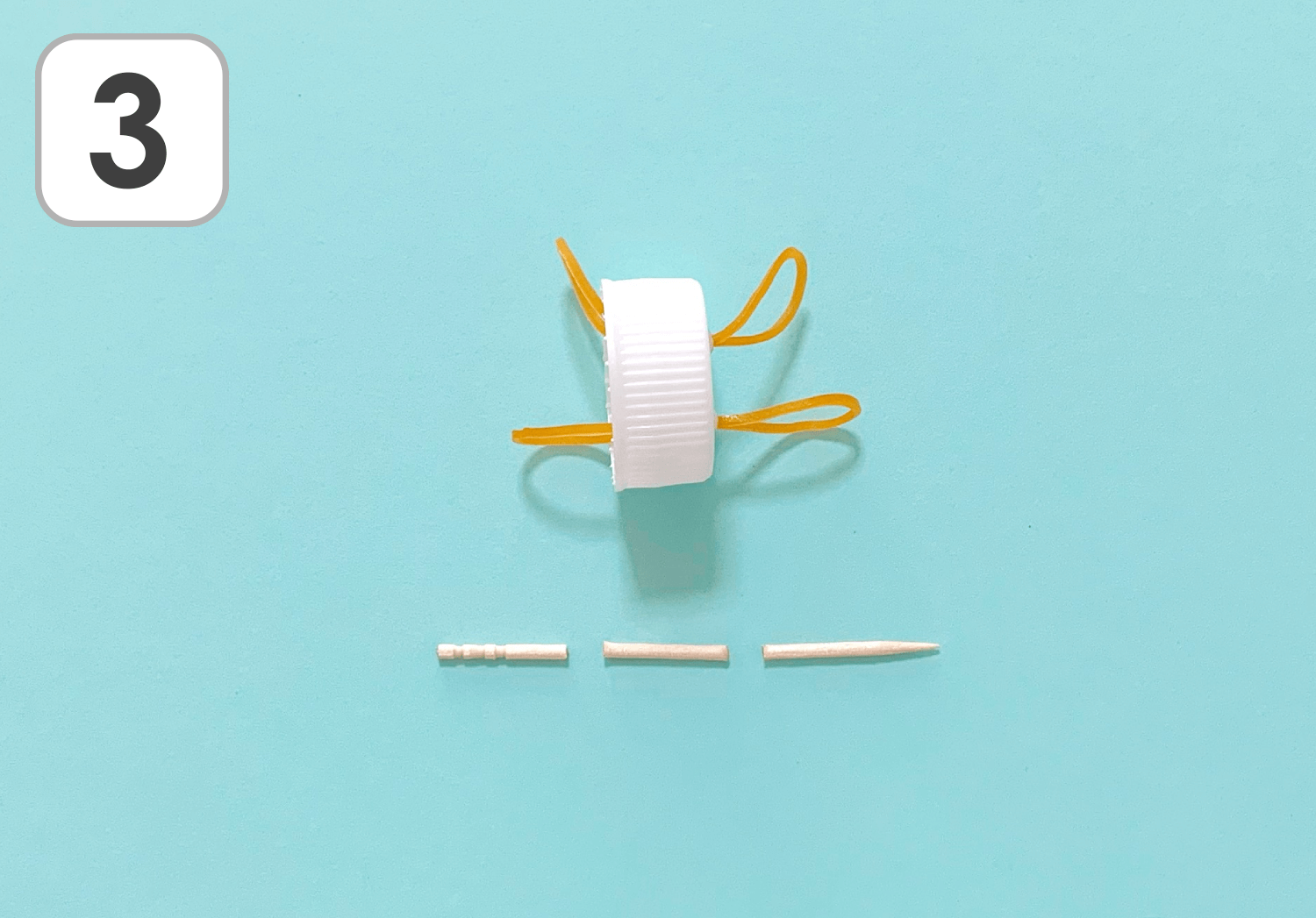 ③穴に輪ゴムを1本づつ通しましょう。 次に、つまようじを3つに切ります。(先が尖っていない、左側の2つを使用します。)