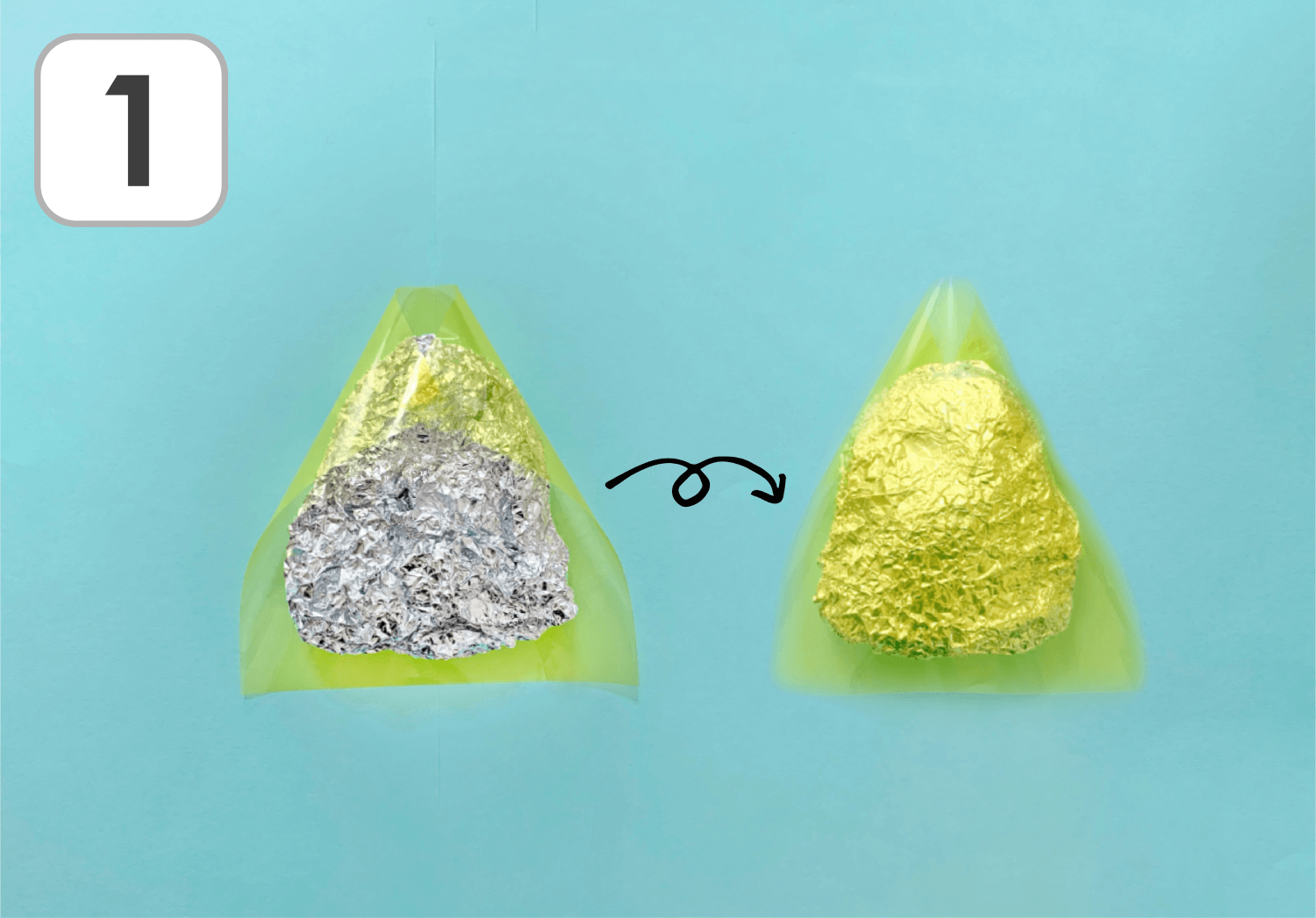 ①アルミホイルをおにぎり型に丸めて、セロファンで写真のように包み、セロハンテープでとめます。できたら裏を向けて置きましょう。