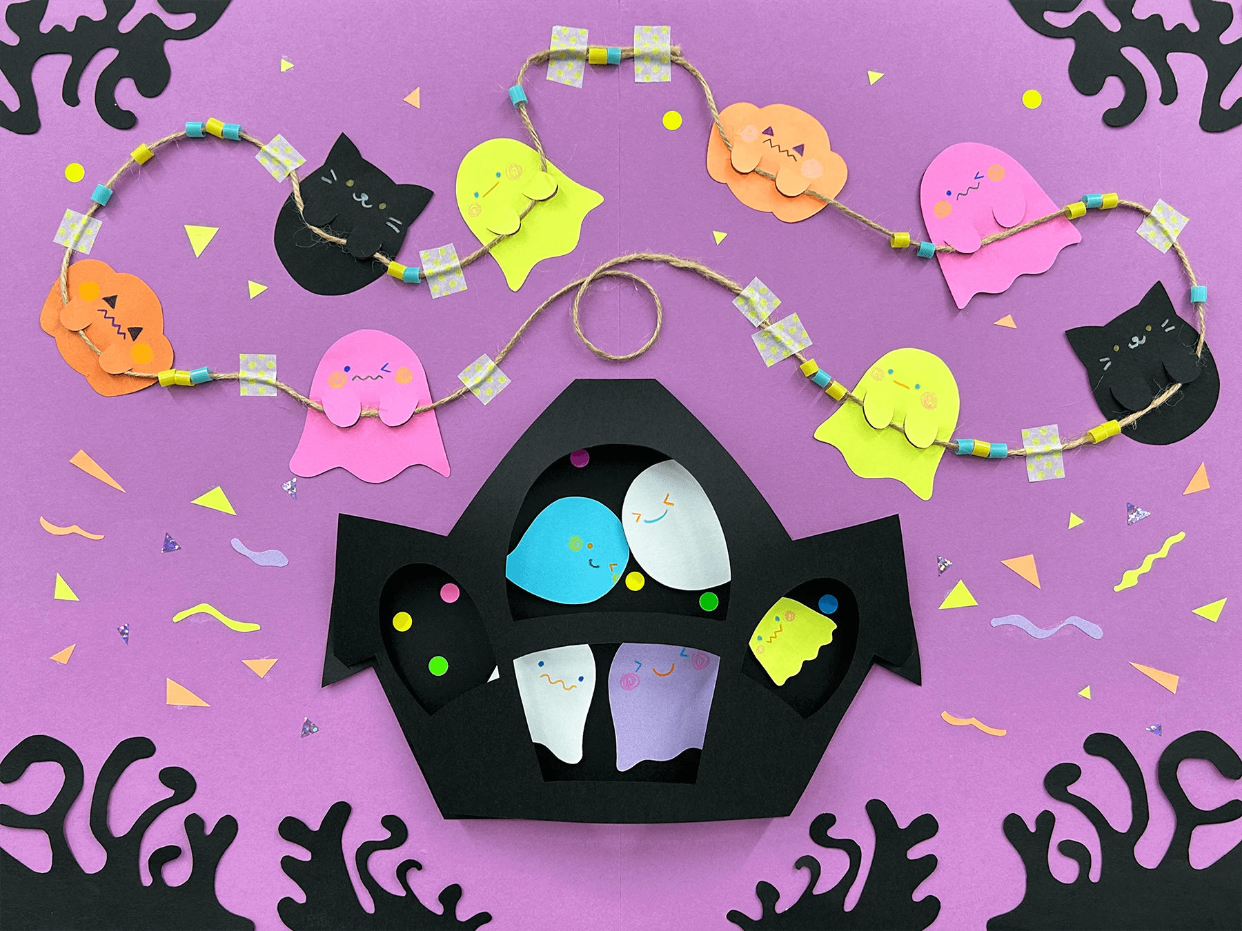 ハロウィンの雰囲気いっぱいの壁面デザイン。画用紙の立体感が楽しい「おばけハウス」と、カラフルなおばけたちがいっぱいの「掴まりおばけのガーランド」で10月の壁面を楽しく元気に飾ろう!