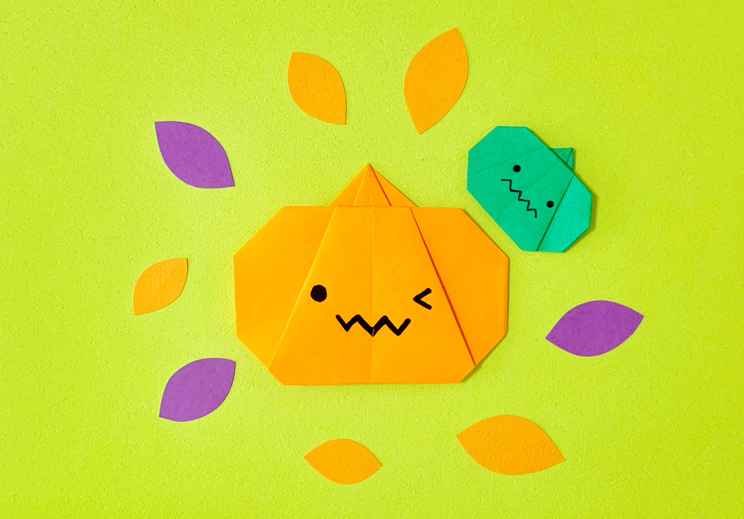実りの秋にぴったりな「かぼちゃ」の折り方。ハロウィンの壁面装飾にもおすすめのおりがみです。1枚でとっても簡単に折ることができるので年少さんからOK!