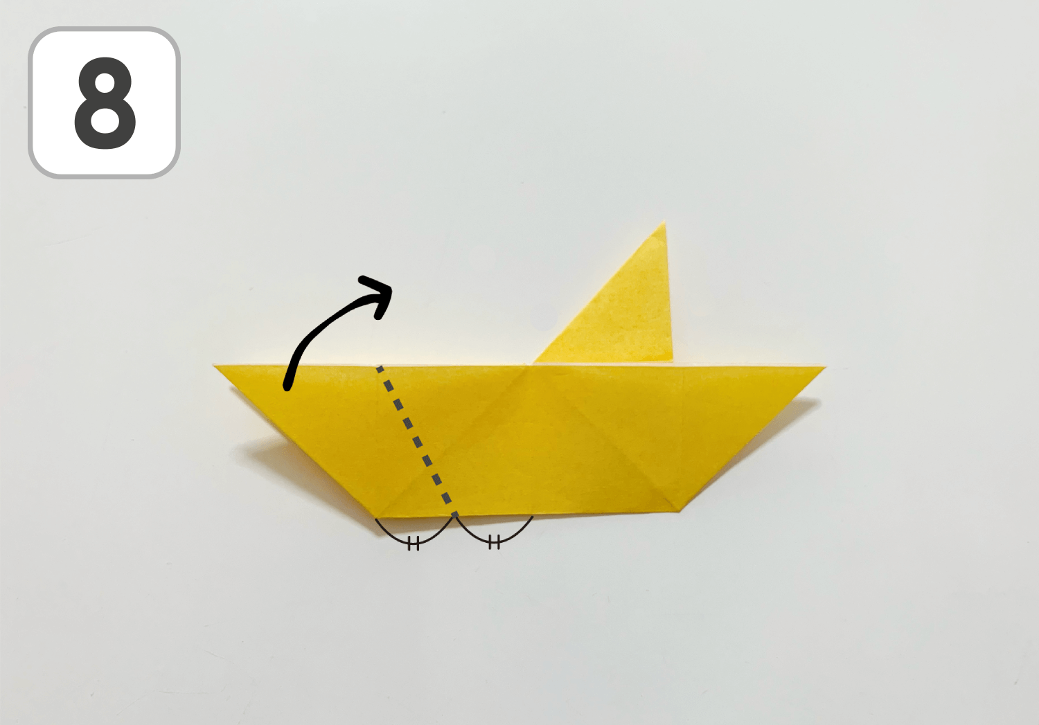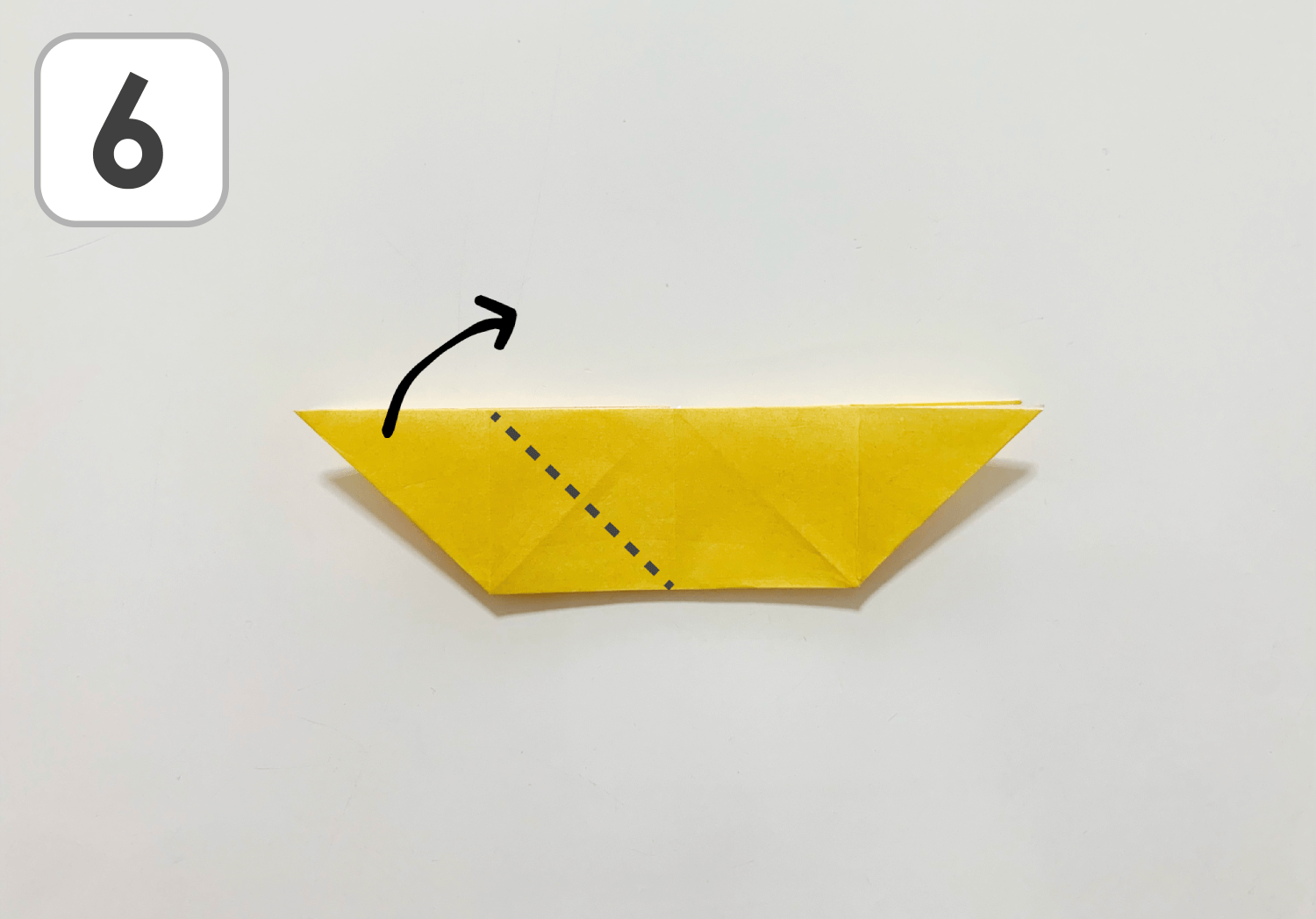 ⑥左の尖った部分の表の一枚を、矢印の方向に点線で折ります。