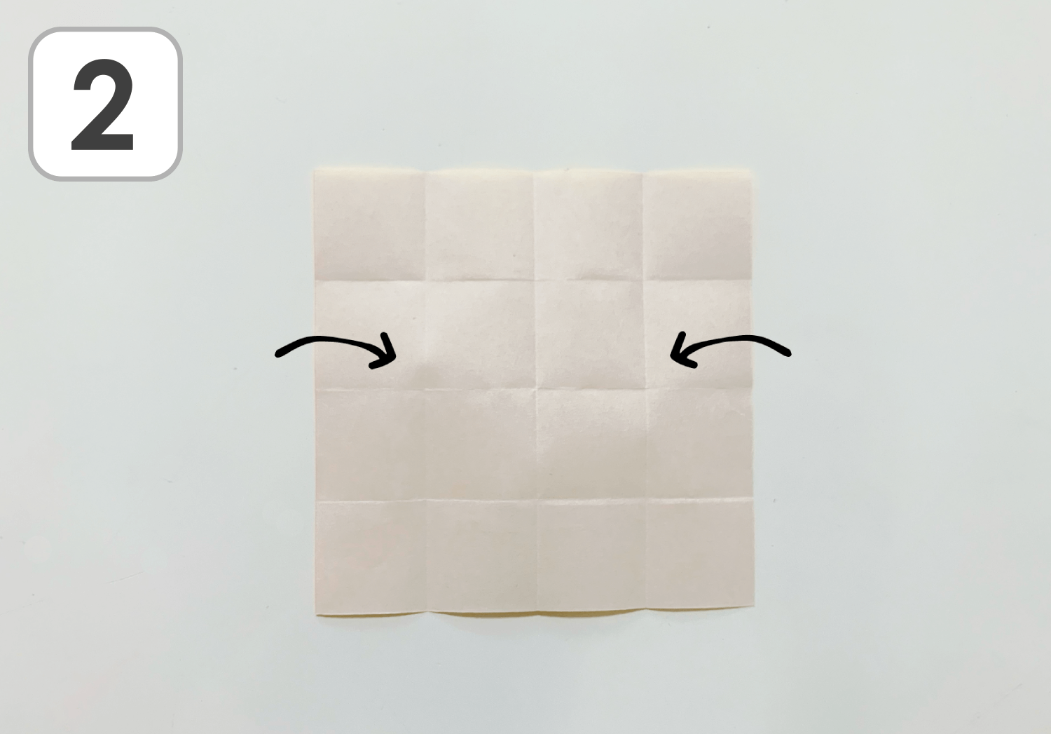 ②縦と横、それぞれに四角に2回折って開き、写真のように折り目を付けます。