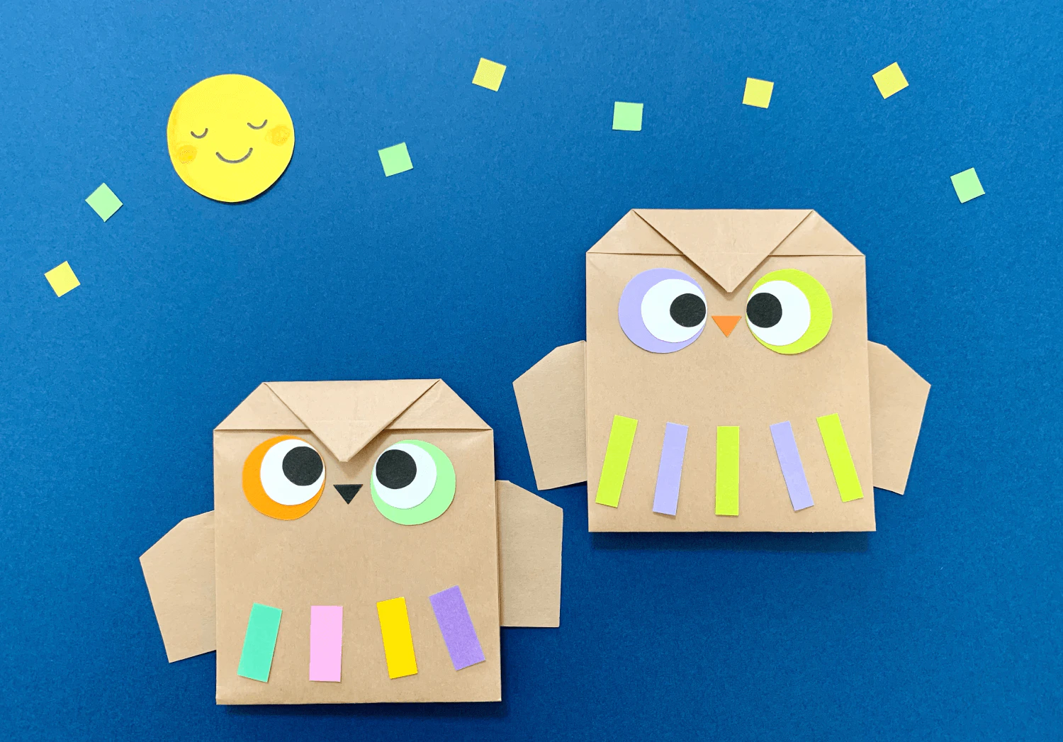 茶色の封筒を使ってフクロウを作ってみよう♪色画用紙で自由に、カラフルに飾り付ければおしゃれなフクロウさんが簡単にできあがります。飾り付けパーツを保育者が事前に用意するなどすれば、低年齢児さんでもOK!