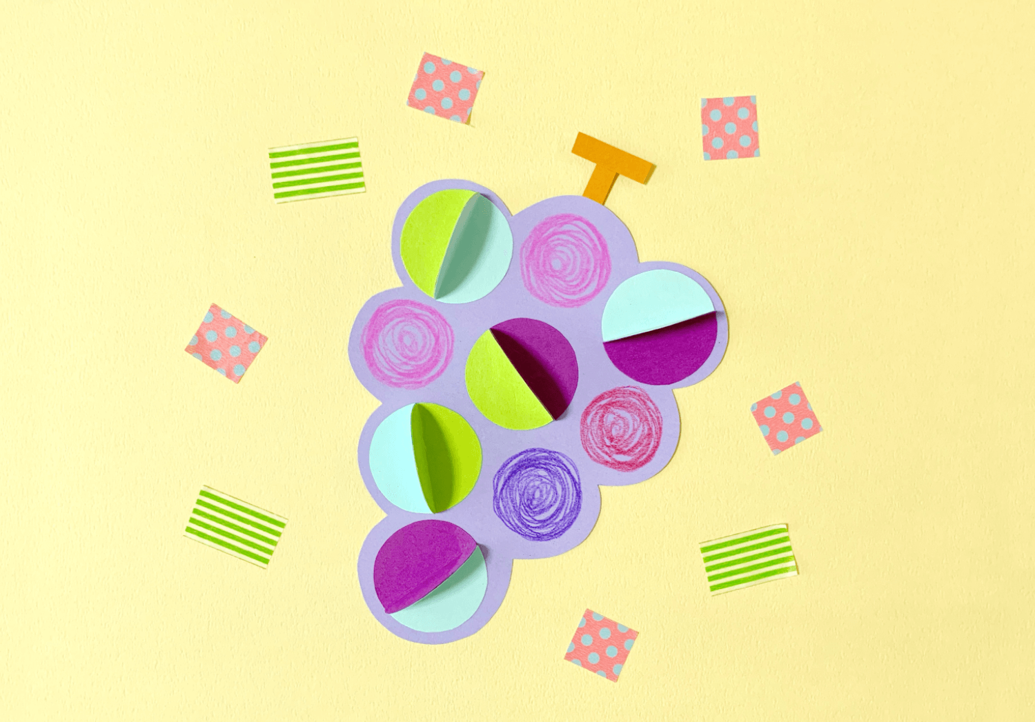 実りの秋におすすめの果物の製作。丸く切った色画用紙を立体的に貼ってブドウの粒を表現します。いろいろな色の画用紙と色鉛筆を用意して、色合わせを楽しみましょう♪