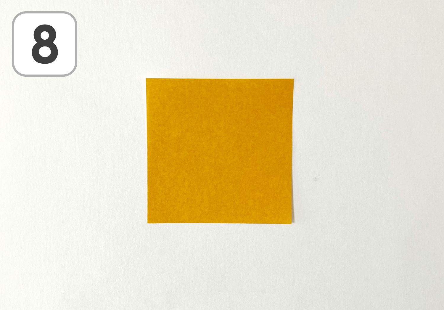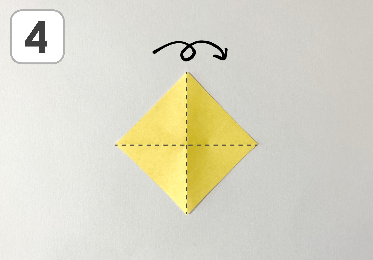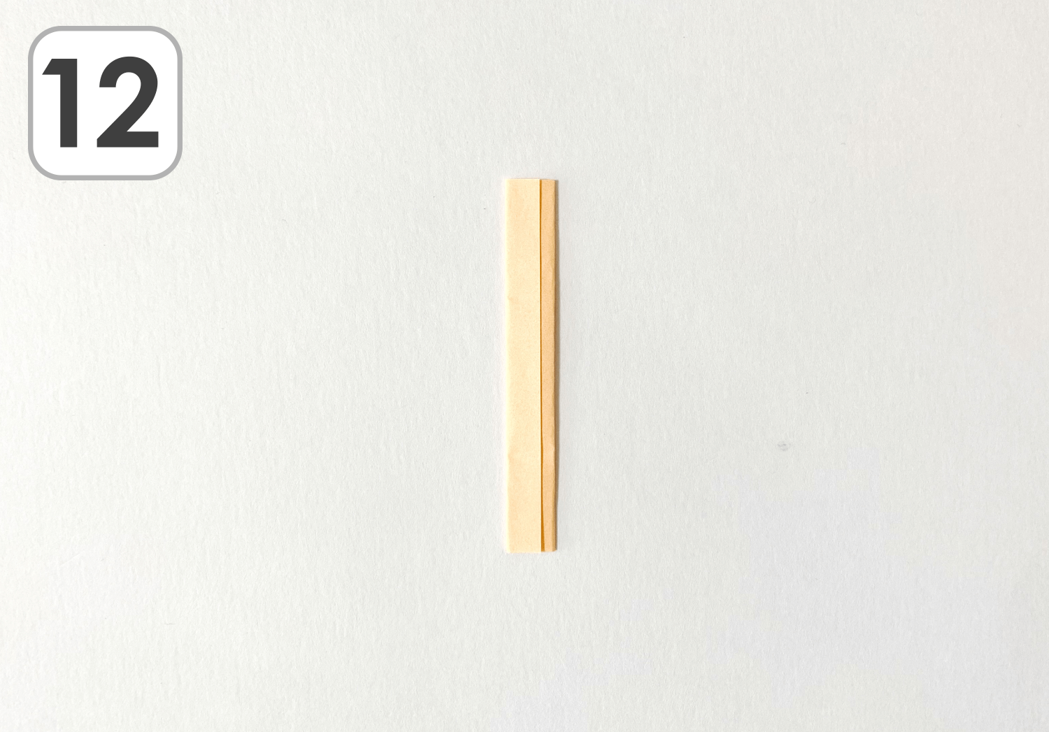 薄橙のおりがみを四角に1回折り、開いたら中央の折り目に合わせて折ります。