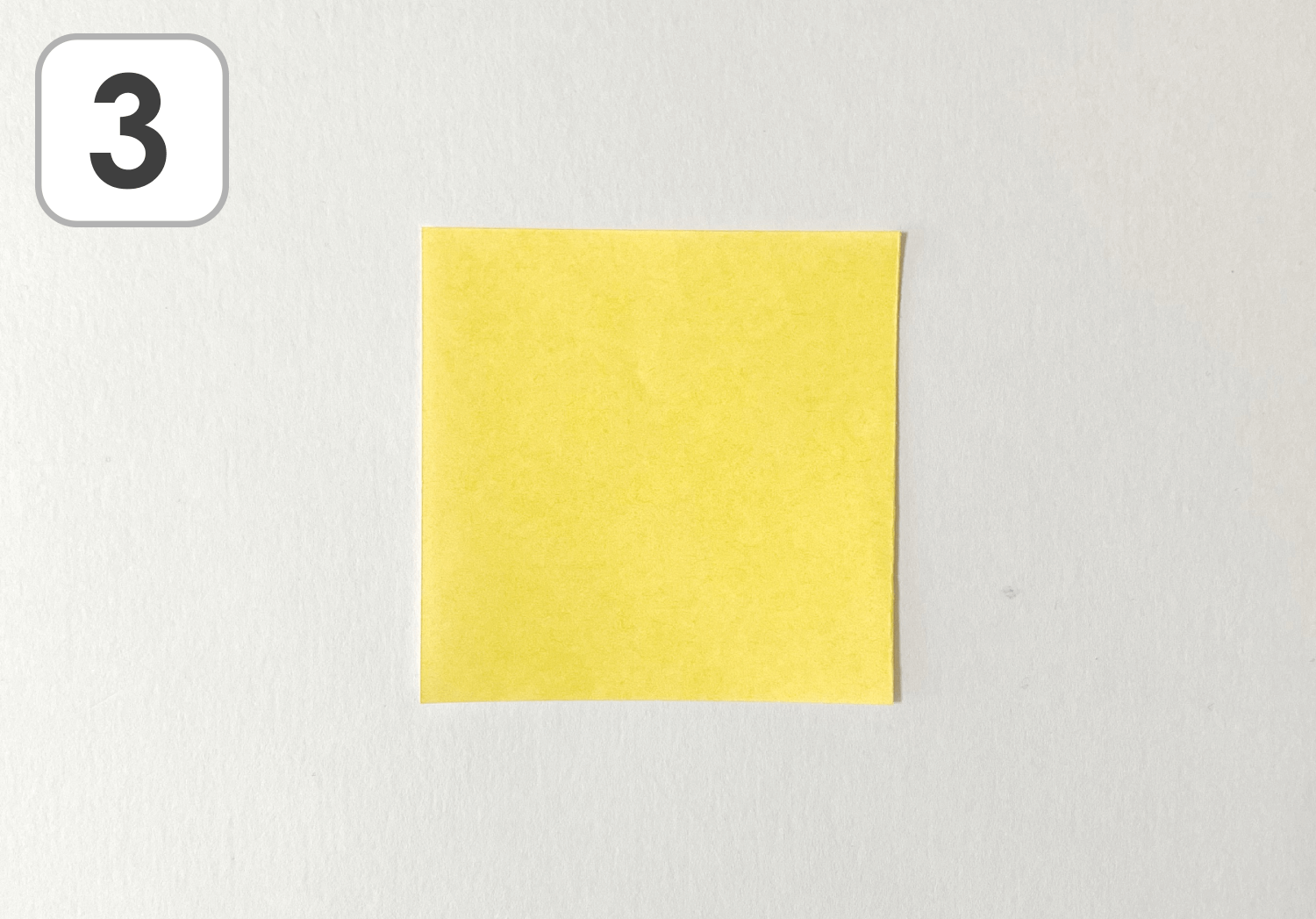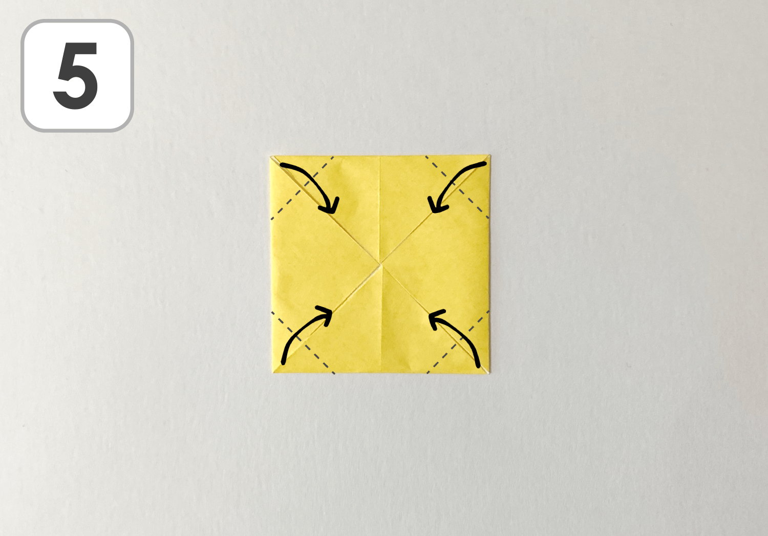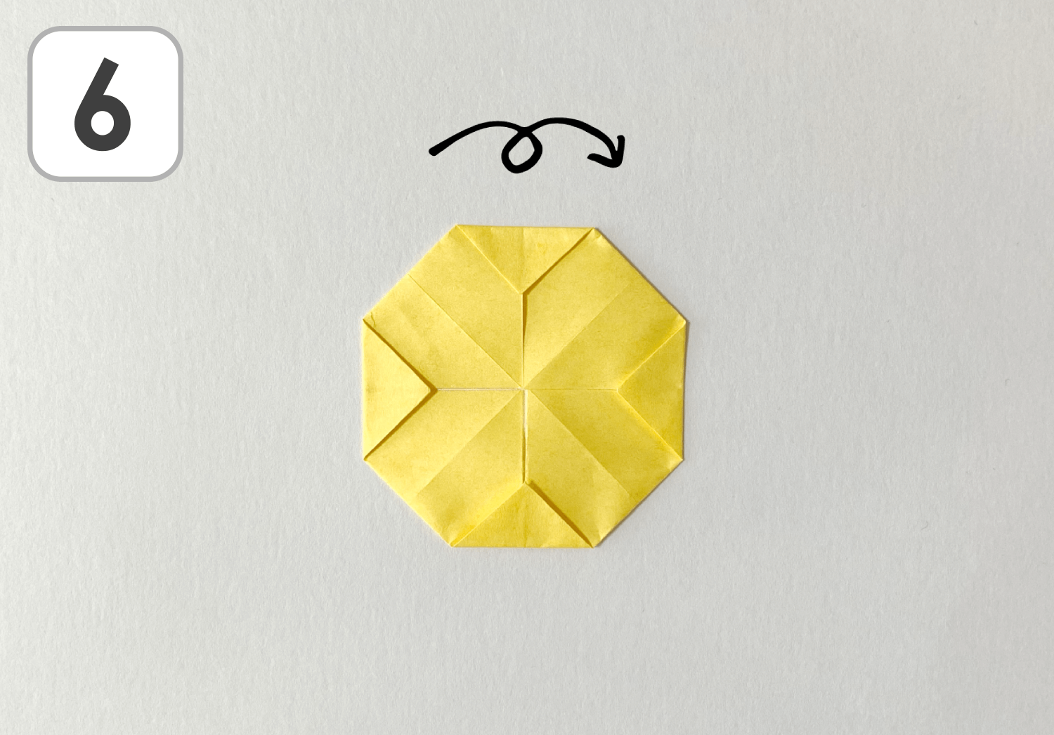薄橙のおりがみを四角に1回折り、開いたら中央の折り目に合わせて折ります。