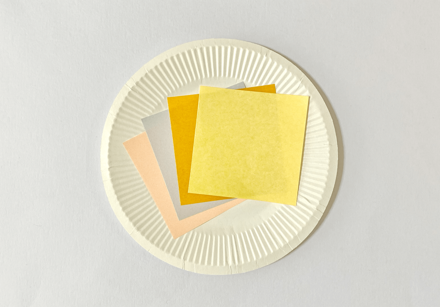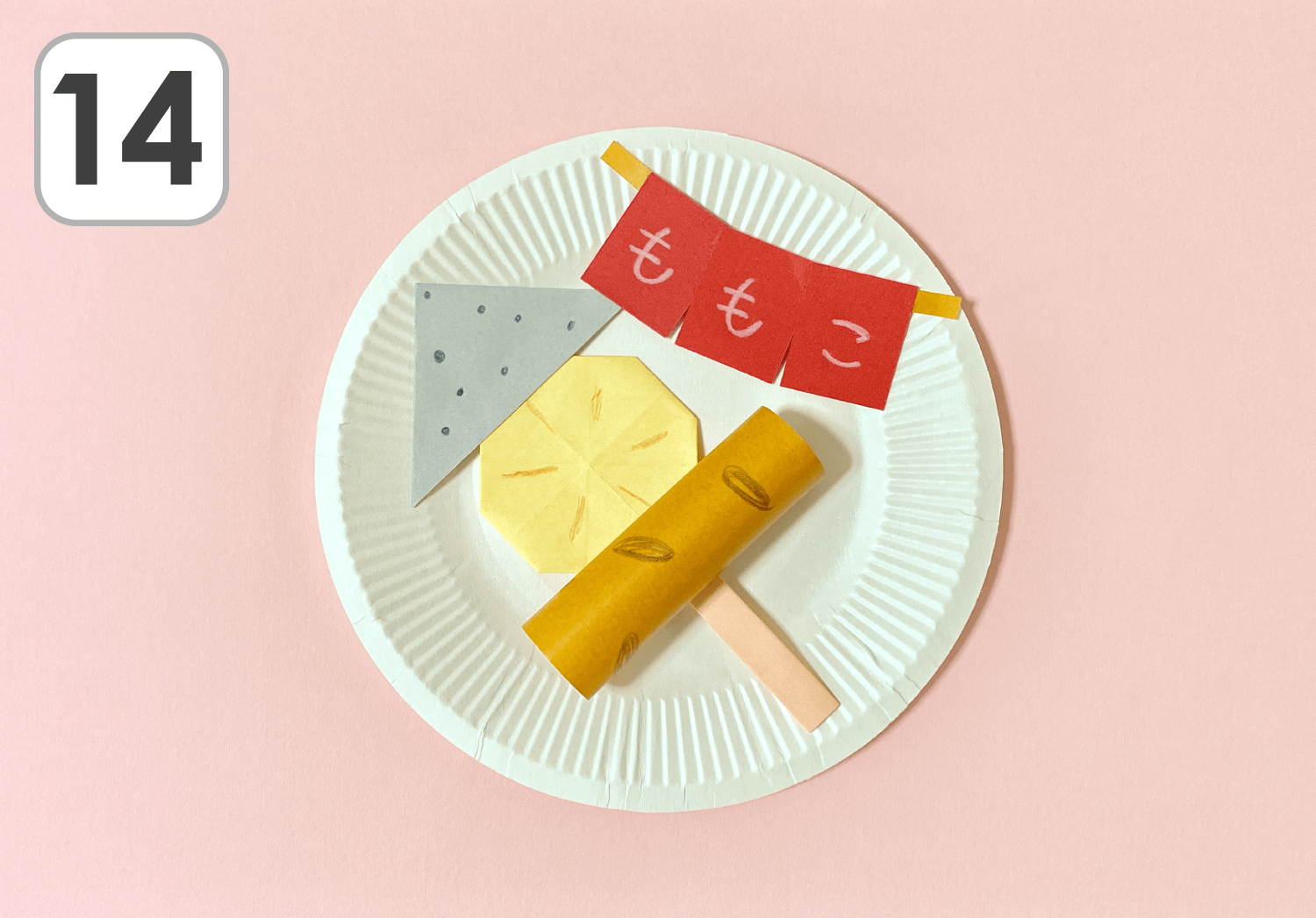 おりがみを使って、こんにゃく、大根、ちくわを作ります。串にさして、紙皿に乗せれば美味しそうな「おでん」のできあがり!