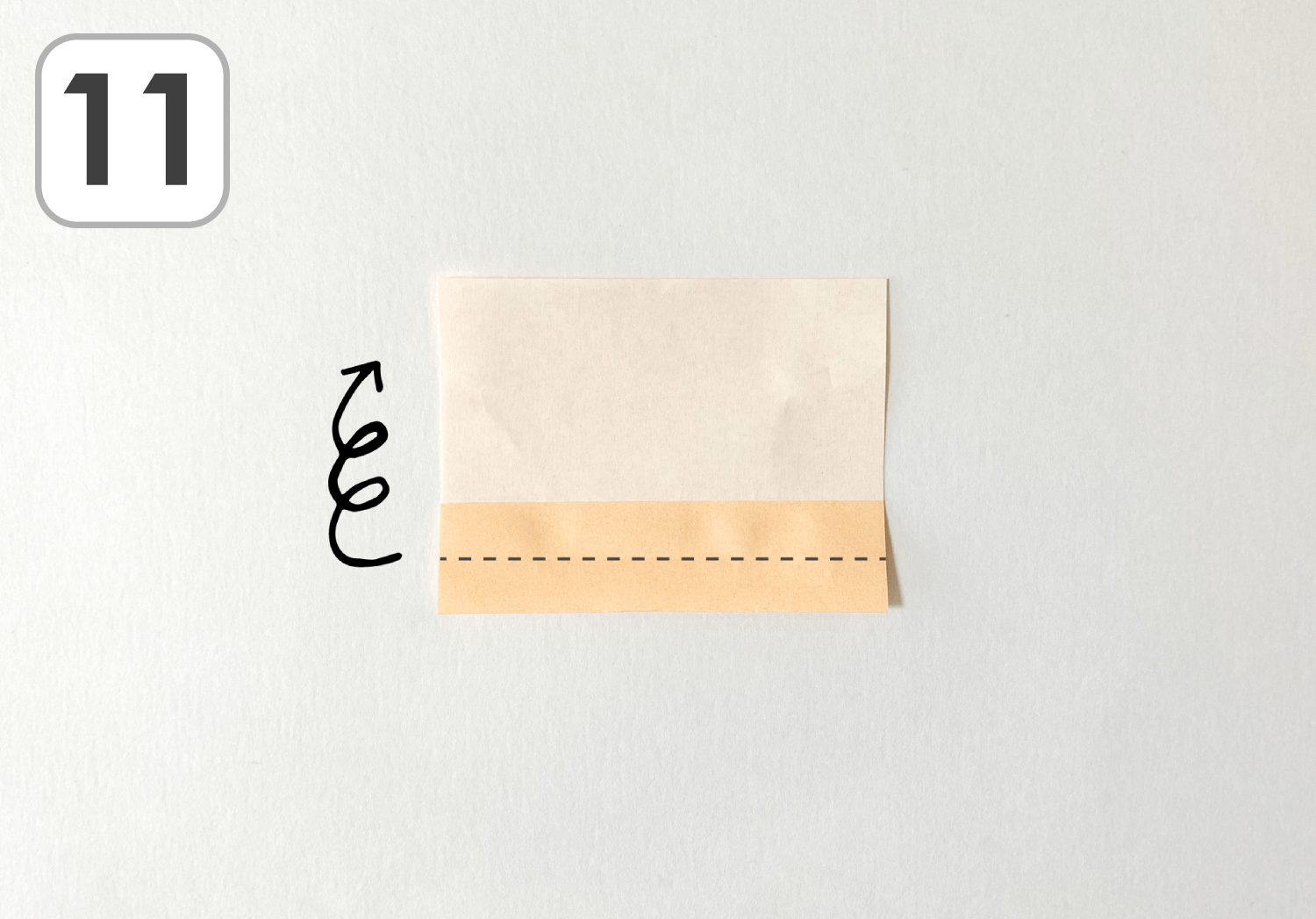点線に沿って半分に折り、そのままクルクル巻くように端まで折ります。