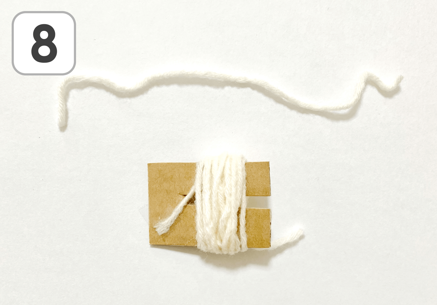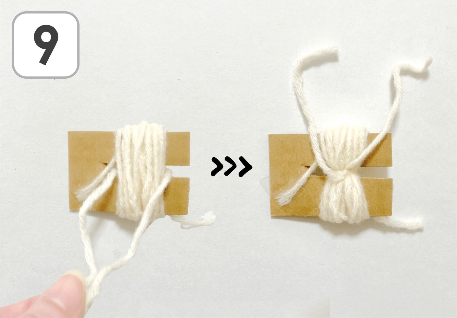 ⑨段ボールの溝の部分を通して、巻いた毛糸の中央をしっかりと結びます。