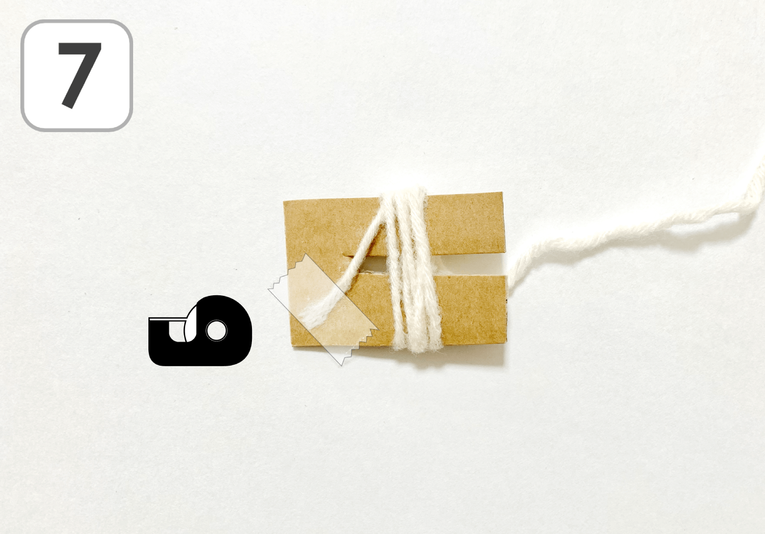 ⑦毛糸の端をセロハンテープでとめて、段ボールに20回位巻き付けます。