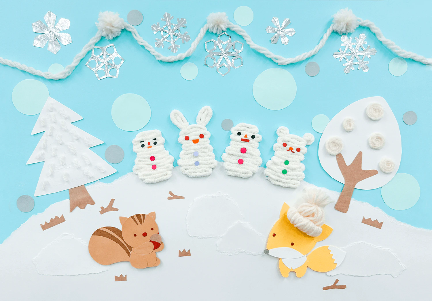 冬ならではの素材を使った「毛糸の雪だるま」や「毛糸のニット帽子」、キラキラおりがみで作る「雪の結晶の切り紙」で雪の森を表現した冬にぴったりの壁面装飾です。