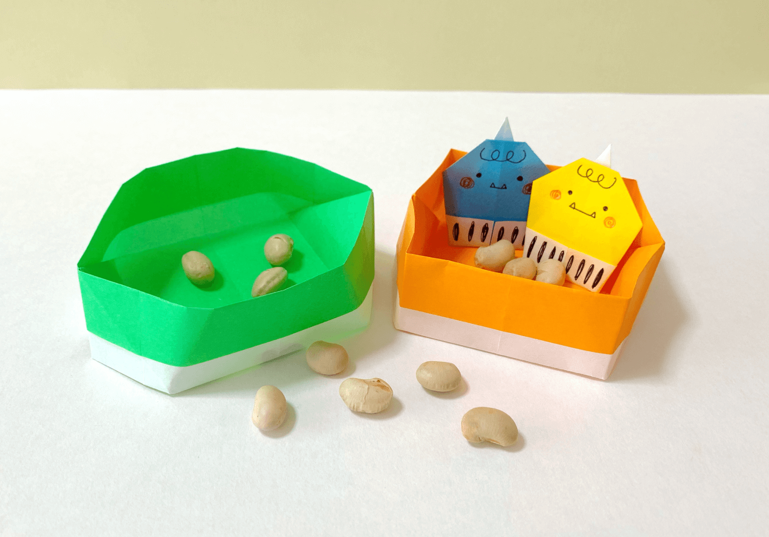 1枚で作れる「ちょっと変わったお豆入れ②」の作り方をご紹介。当別な準備はなく、おりがみだけでとっても簡単に作ることができます。子ども達と楽しく作って、節分行事でお豆を入れて使ってみてくださいね。