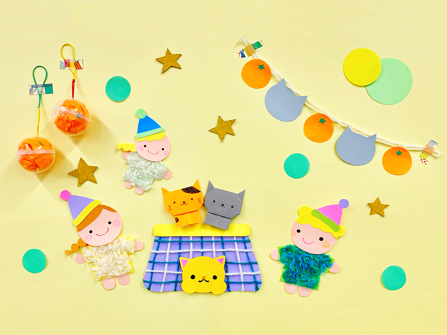 2月の保育室を温かな雰囲気にしてくれる、こたつとみかんをモチーフにした壁面アイデア。毛糸を使って作るセーターや、ガチャガチャカプセルのみかんヨーヨー、1枚で作れるおりがみのねこを楽しく飾ってみましょう。