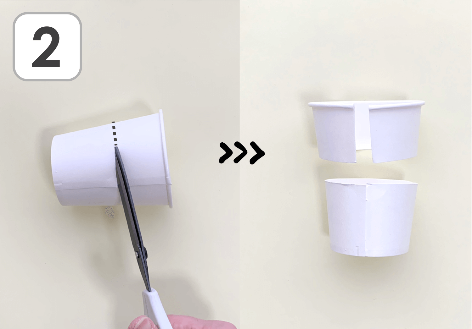 ①紙コップの淵から底に向かって4cmくらい切り込みを入れます。