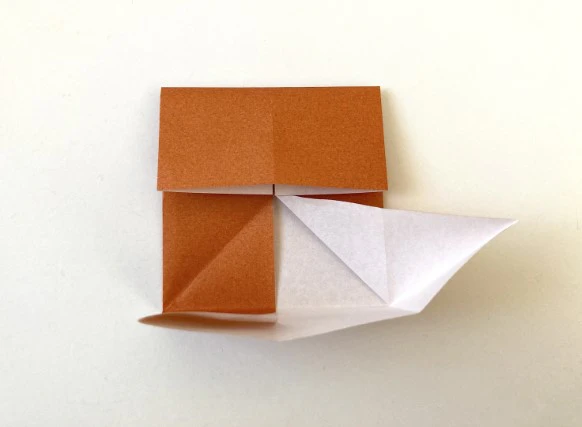 ②3つの角を折り紙の中心に向かって折り、残りのひとつは後ろ側に折ります。