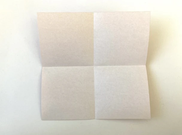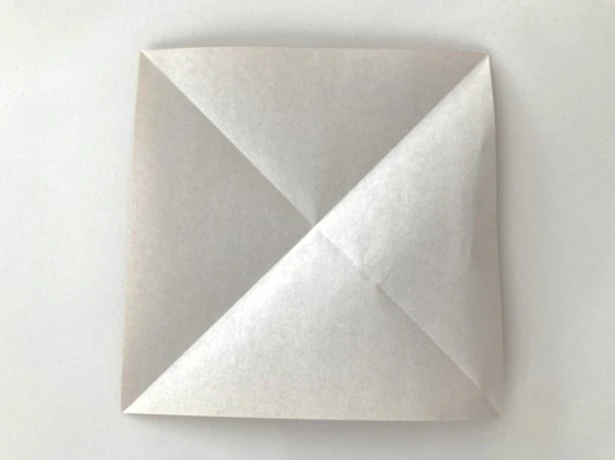 ①折り紙で三角形になるように2回折って、折り紙の対角線に折り目を付けます。
