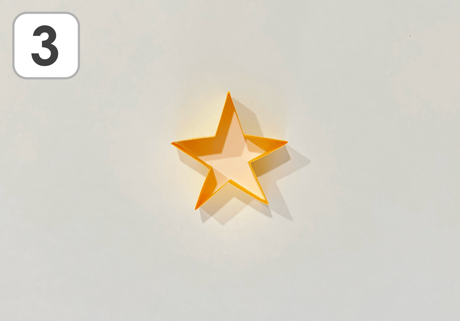 ③黄色のおりがみの端と端を重ねてのりで貼りると、星の形になります。