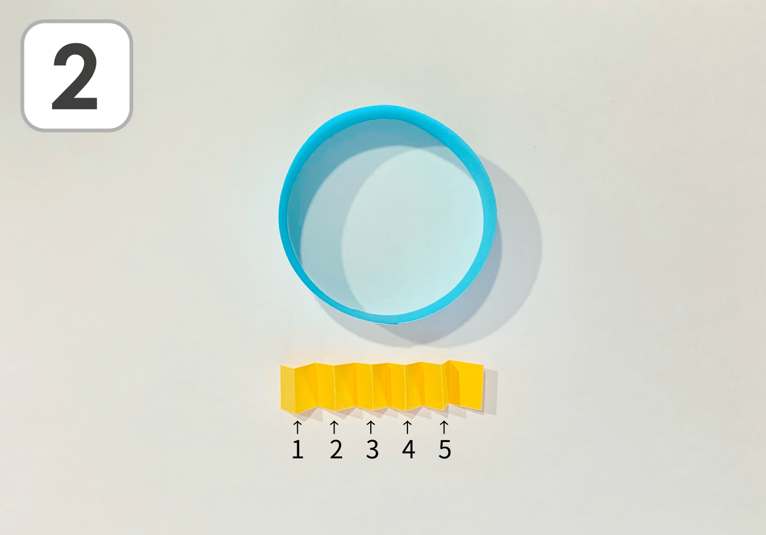 黄色の色画用紙は2cm幅のジャバラ折りにして、5つの山を作ります。