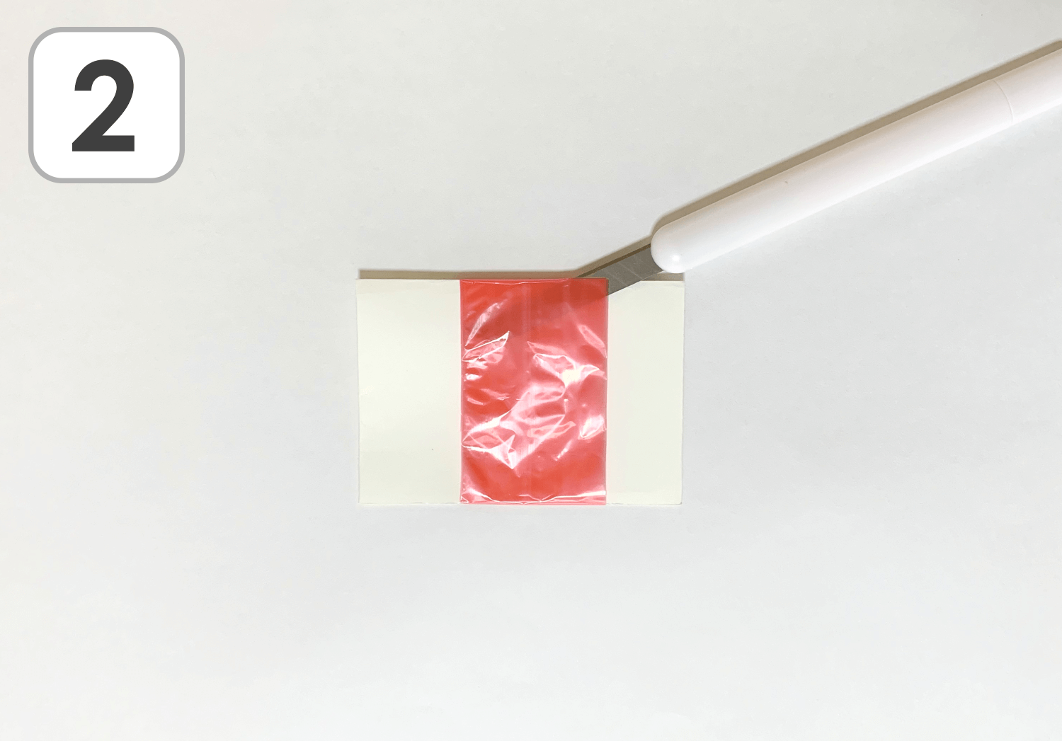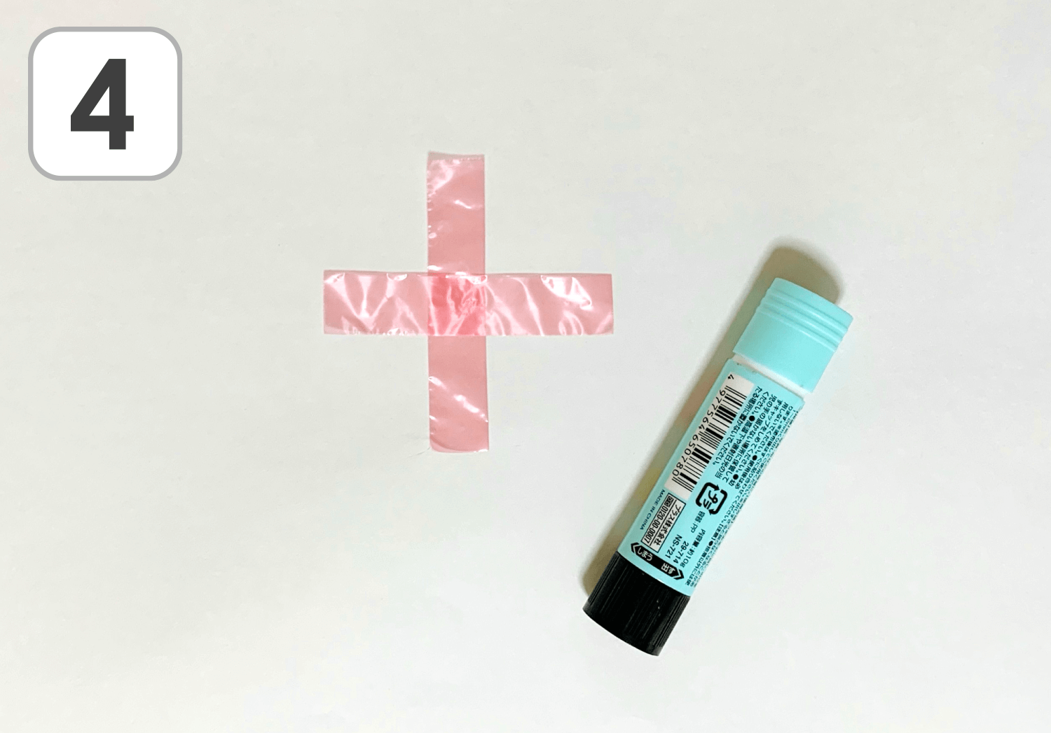 まず、2枚のテープを十字になるように置き、重なった部分をのりで貼り付けます。