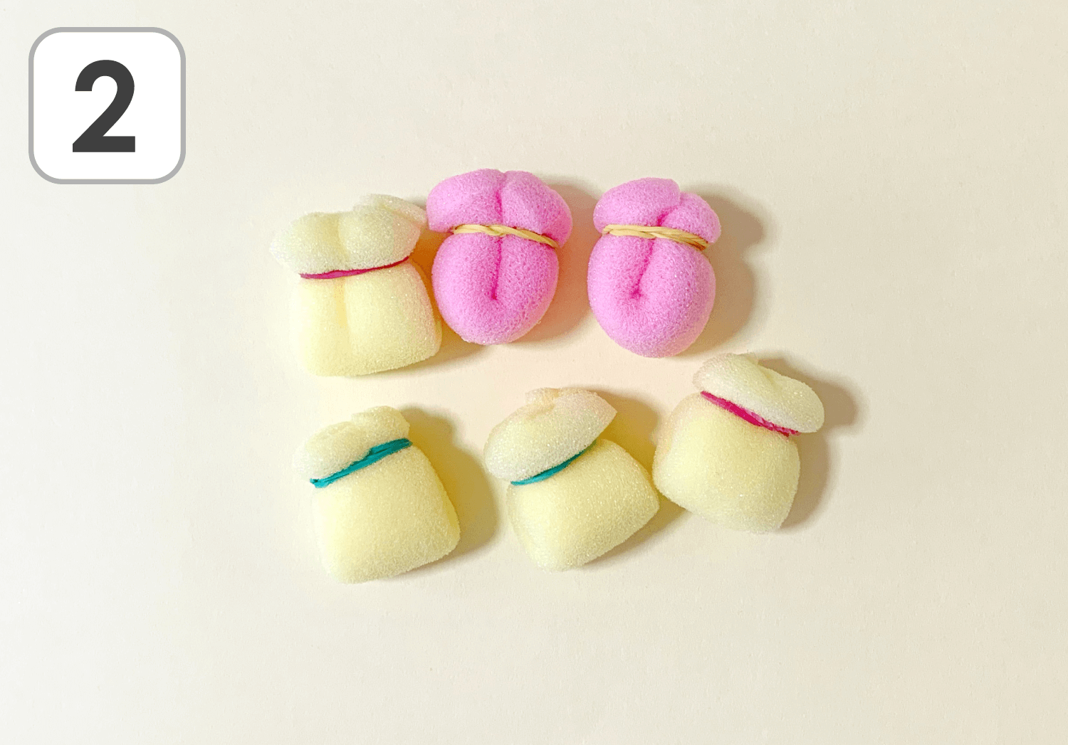 切ったスポンジを端からくるくると巻いて半分に折り、輪ゴムで留めます。