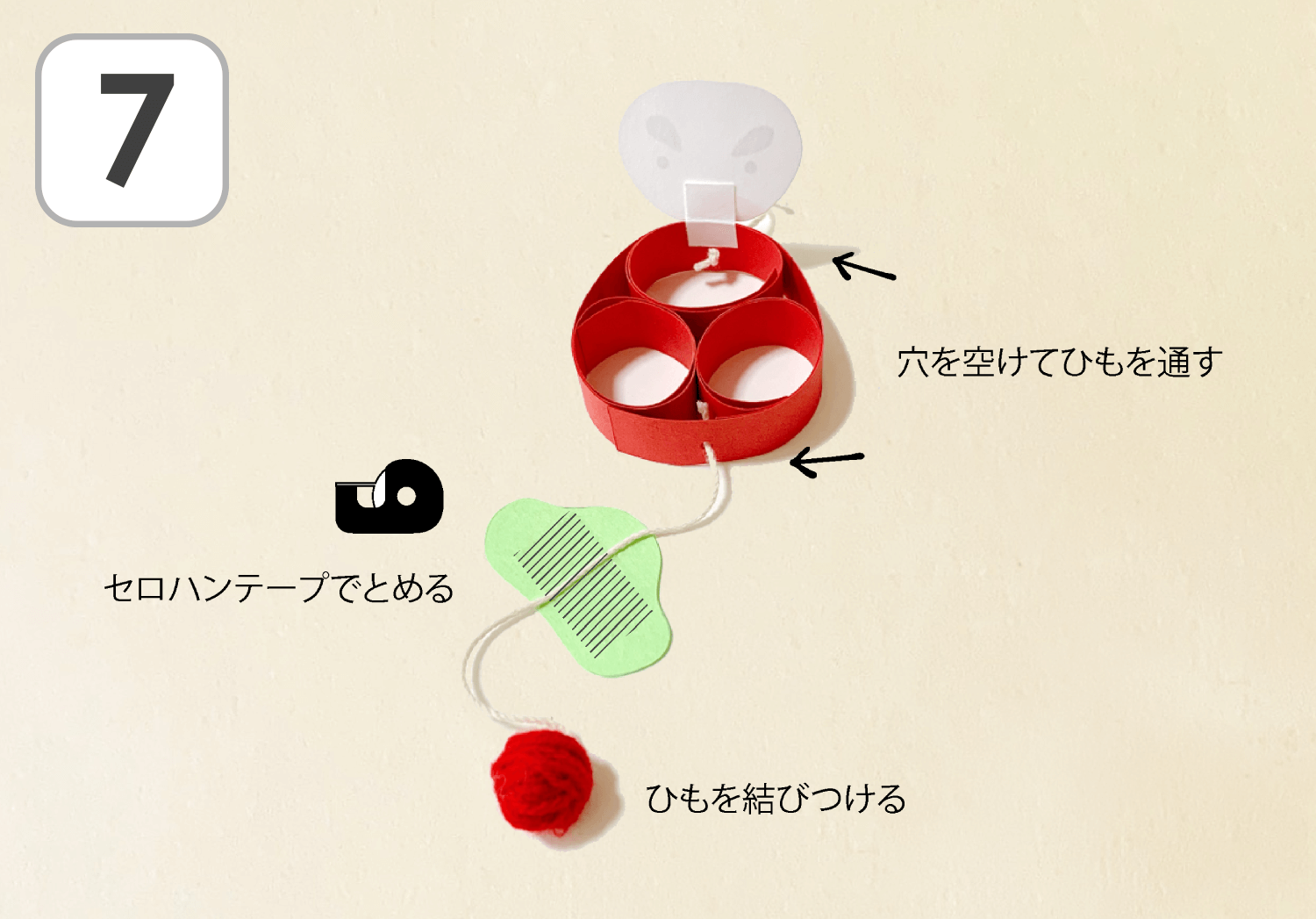 ⑦だるまの上下にキリで穴をあけ、タコ糸を通し、結び目を作って抜けないようにします。 色画用紙で松や梅の形を切り出して、下のひもに装飾しましょう♪